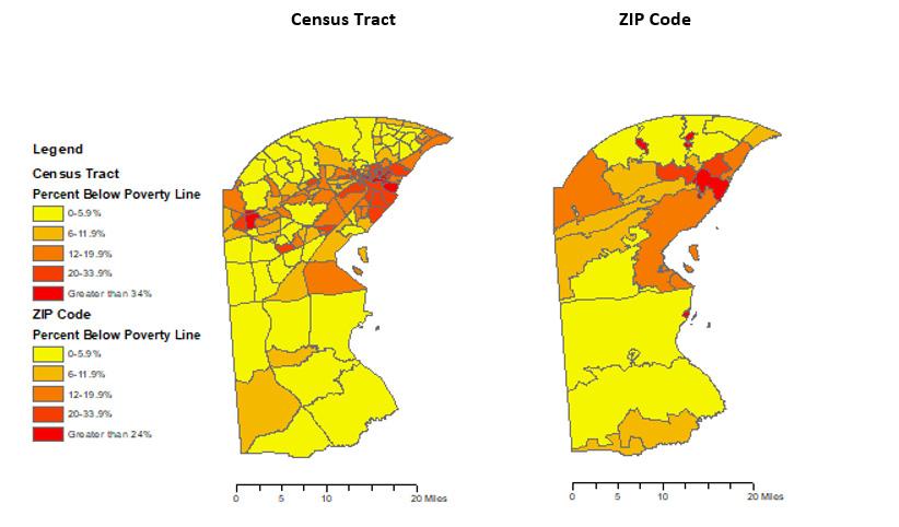 In this commentary, we consider how different geographic units can influence our understanding of important public health issues by comparing two poverty rate heat maps of New Castle County: the first based on census tracts and the second on ZIP codes. Poverty level was chosen because studies have consistently shown that economic and health status are intertwined with the stresses of poverty often being linked to adverse health effects.1 After highlighting the impact that a geographic unit can have on data visualization, we illustrate how heat maps designed by The Center for Drug and Health Studies (CDHS) at the University of Delaware have been used to track changes in substance use rates, identify resource desserts, and help policy makers and other stakeholders understand the health and prevention needs of various communities across the state.