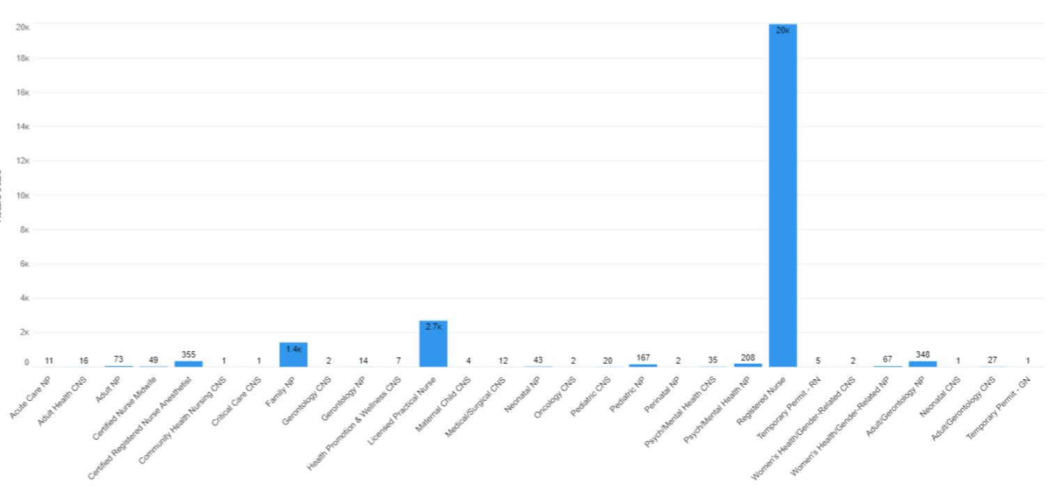 As of June 2022, there were 63,123 active healthcare licenses in DELPROS. This number includes 3,529 institutional licenses (e.g., pharmacies and funeral establishments). There are also 7,760 additional licenses issued for prescribing controlled substances which are issued to both individuals and facilities. After accounting for institutions and certain duplications, there are 56,469 individual healthcare providers in DELPROS. This count includes: approximately 26,000 nursing licenses; 9,900 medical practice licenses, (e.g., physicians and physician assistants); 2,600 pharmacist licenses; 2,700 social work-related licenses; and 1,700 dentistry licenses (e.g., dentists and dental hygienists). The remaining boards each account for 1,100 or fewer licensees per board and are covered in detail in this report.