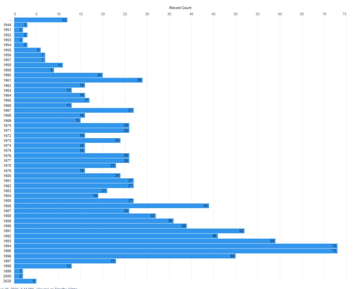 Overall, the licensed healthcare workforce in DELPROS is about 43,000 female (74%) and 15,000 male (26%). Gender is not reported for 4,566 licensees either because individuals did not disclose their gender or because the licensing database contains institutions which do not have a gender demographic. Based on year of birth (where individuals born in 1954 – 1955 are deemed by Social Security as age eligible for full Social Security benefits, we find that no less than 4,600 active licensed individuals are of full retirement age.
