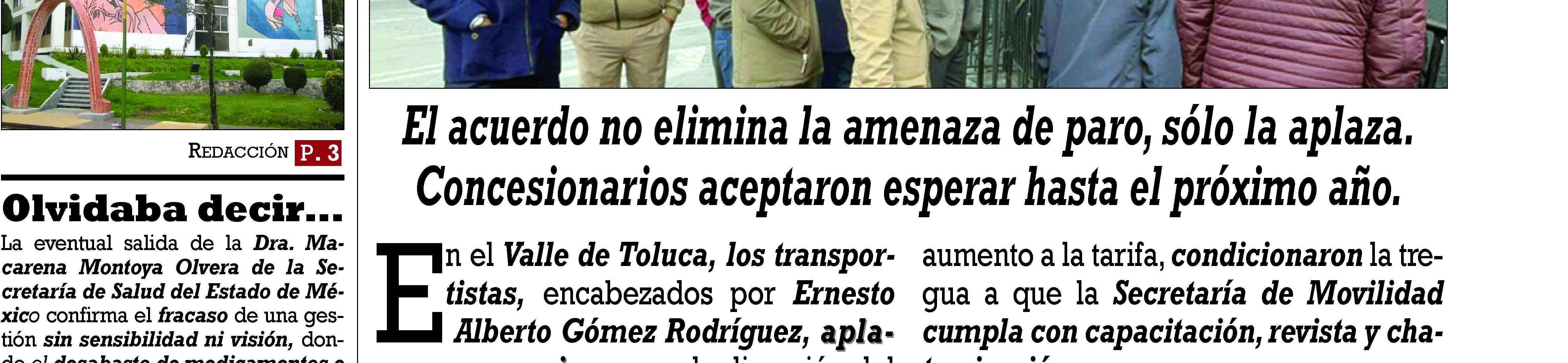 tentativaparaellevantamientodel paro,peroconsideraránuntiempo necesarioparapermitirelregreso delosalumnosquenosonoriundosdelaciudaddeToluca. Noobstante,reiteróquesinoexistenmásinconvenientesquefrenen lostrabajosoelavanceenelcumplimientodesusexigencias,enel transcursodeestasemanapodrían