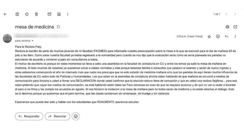 decisionesbasadasendocumentos fueradecontexto,sinoencomunicadosyacuerdosoficialesemitidospor laAsambleadelaFacultadde Medicina.Respaldaronquehaycondicionesparaeldiálogoysupropósitoesqueesteseconcreteconapertura,respetoyvoluntadmutua. Finalmente,externaronunainvitaciónalarectorayasuequipodetrabajoparaqueacudanalaFacultadde Medicinaadialogarconelestudiantadoconfechatentativaestemiércoles30dejulioyconelobjetivode retomarelacercamientoyavanzaren laatenciónasusdemandas,puessu movimientoespacíficoyestámotivadoporunprofundocompromisocon lamejoradeesteespacio,porloque rechazaroncualquierformadeviolencia,hostigamientooconfrontación.