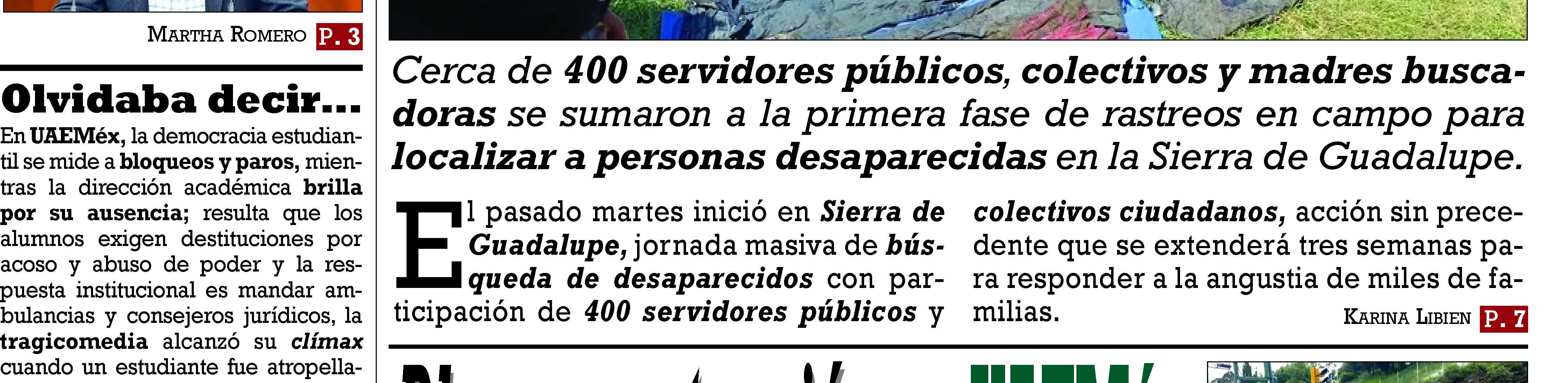 Elpasadomartes,comenzóla jornadamasivadebúsqueda depersonasdesaparecidas enlaSierradeGuadalupe,unade lasaccionesmásampliasyorganizadasquesehayanrealizadoenel EstadodeMéxico,participaron alrededorde400servidorespúblicosdelascomisionesdebúsqueda delaCiudaddeMéxicoydelpropioEstadodeMéxico,juntocon célulasmunicipalesdeEcatepec, Tultitlán,Coacalcoy Tlalnepantla,ademásdelaparticipaciónactivadecolectivosciudadanosymadresbuscadorasque, desdehaceaños,hanencabezado esfuerzosindependientespara encontrarasusfamiliares.