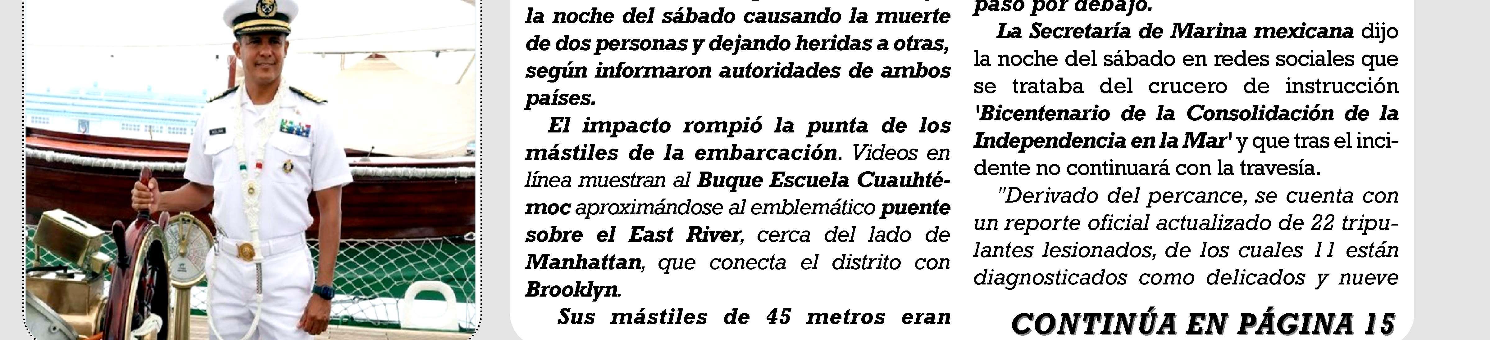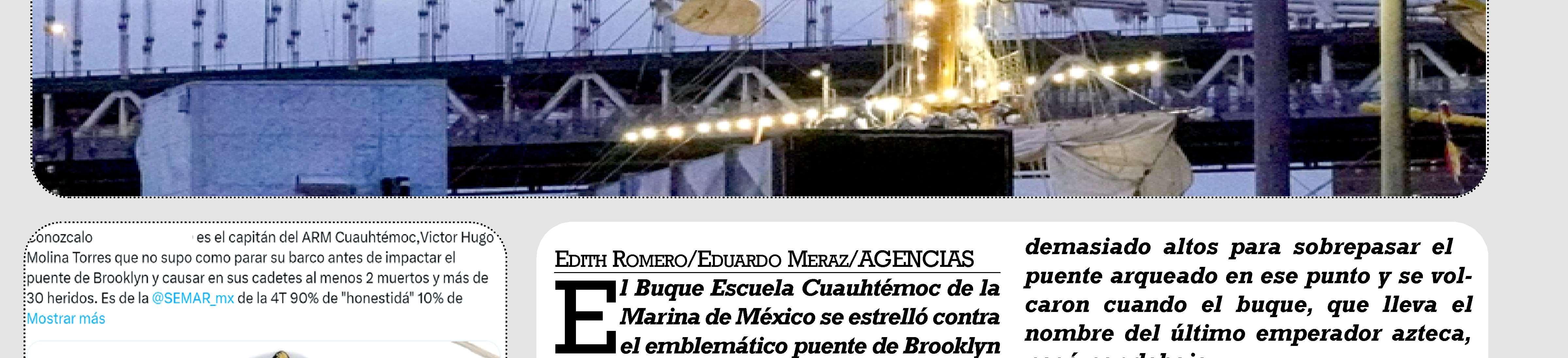 El BuqueEscuelaCuauhtémoc,emblemaflotante de la Armada de México, colisionó el pasado sábado con el puente de Brooklyn, matando a dos jóvenes tripulantes e hiriendo a más de veinte, ante la mirada atónita de cientos de testigos.