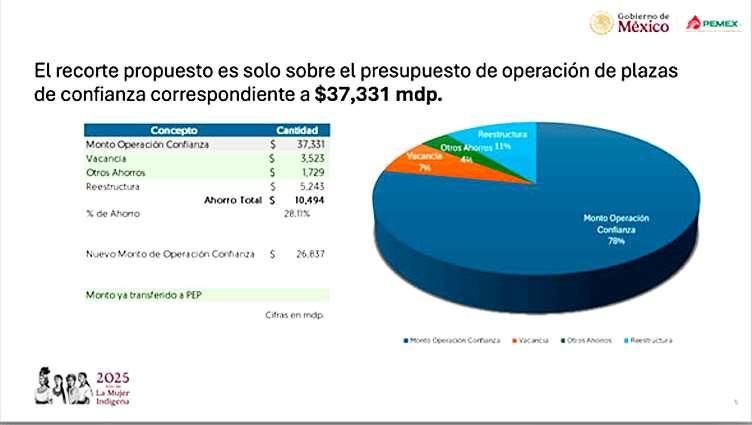 Además, para generar más ahorros, la empresa petrolera prevé dejar de gastar mil 17 millones de pesos en viáticos,199 millones de pesos en "actividades de riesgo", y 174.5 millones en tiempo extra, además de que no contratará personal para las vacantes sindicalizadas