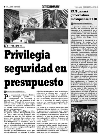 or unanimidad, el Cuerpo Edilicio de Naucalpan aprobó el Presupuesto de Ingresos y Egresos 2017, por un monto de 3 mil 991 millones 682 mil 400 pesos, recursos que serán destinados para seguir trabajando en seguridad, infraestructura, obras comunitarias y desarrollo social, principalmente. El alcalde, Edgar Olvera Higuera, informó que en materia de seguridad pública, para este año se destinará una inversión de más de 700 millones de pesos, para reforzar las acciones que permitan eficientar el servicio y dar más tranquilidad a la población, para lo cual se tiene previsto la adquisición de parque vehicular, helicóptero, una academia, así como equipo para los policías, entre otros puntos. Precisó que el presupuesto 2017, permitirá mantener el objetivo de seguir