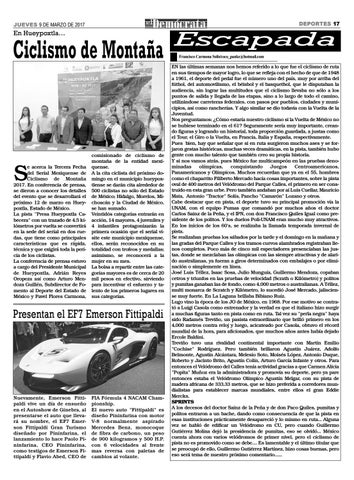 e acerca la Tercera Fecha del Serial Mexiquense de Ciclismo de Montaña 2017. En conferencia de prensa, se dieron a conocer los detalles del evento que se desarrollará el próximo 12 de marzo en Hueypoxtla, Estado de México. La pista "Presa Hueypoxtla Cabecera" con un trazado de 4.5 kilómetros por vuelta se convertirá en la sede del serial en dos ruedas, que tiene como principales características que es rápida, técnica y que exigirá toda la pericia de los ciclistas. La conferencia de prensa estuvo a cargo del Presidente Municipal de Hueypoxtla, Adrián Reyes Oropeza así como Arturo Mendoza Guillén, Subdirector de Fomento al Deporte del Estado de México y Pavel Flores Carmona,