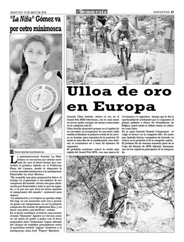 14 minutos 11 segundos, tiempo que le dio la oportunidad de arrebatarle por 11 segundos el primer peldaño a Pierre De Froindmont, de Bélgica, quien hasta el último tramo se ubicaba como líder. En la rama femenil Daniela Campuzano se colgó el bronce en la categoría élite. En tanto que, Isabella García, compañera de Gerardo, se colocó en la posición 9 de la categoría cadete. El próximo fin de semana tomarán parte de la Copa del Mundo de MTB Albstad, Alemania, uno de los objetivos principales de la temporada.