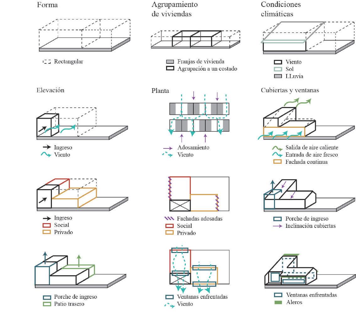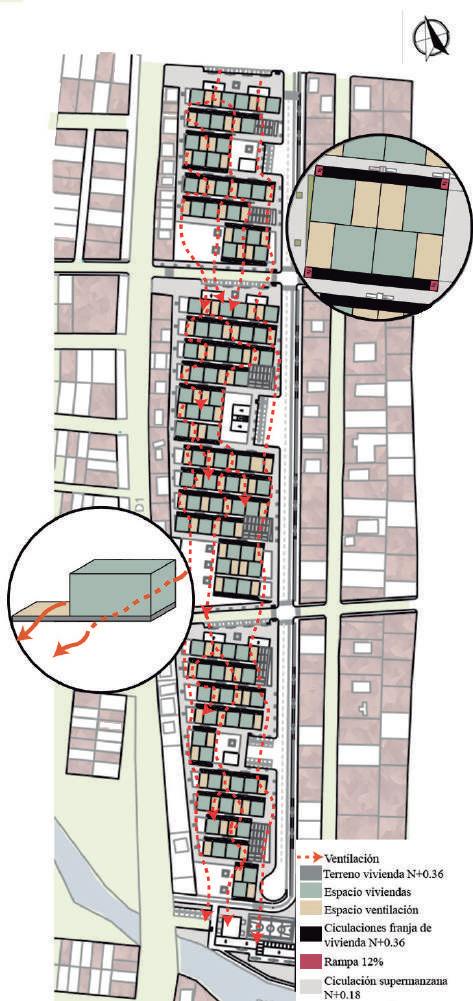 La ventilación a nivel urbano se resolvió calculando las sombras de viento y colocando las viviendas de manera que exista mejor movimiento, mientras que a nivel arquitectónico se aprovechó el viento en las fachadas más largas y asegurando que tengan opción de salida para que funcione la ventilación cruzada