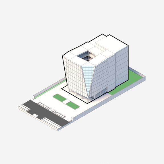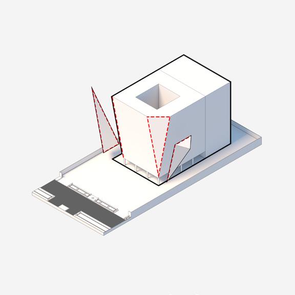 The façade which is cut at the corners is an adaptation to the bookshelves which must be protected from the sun but still get natural light.