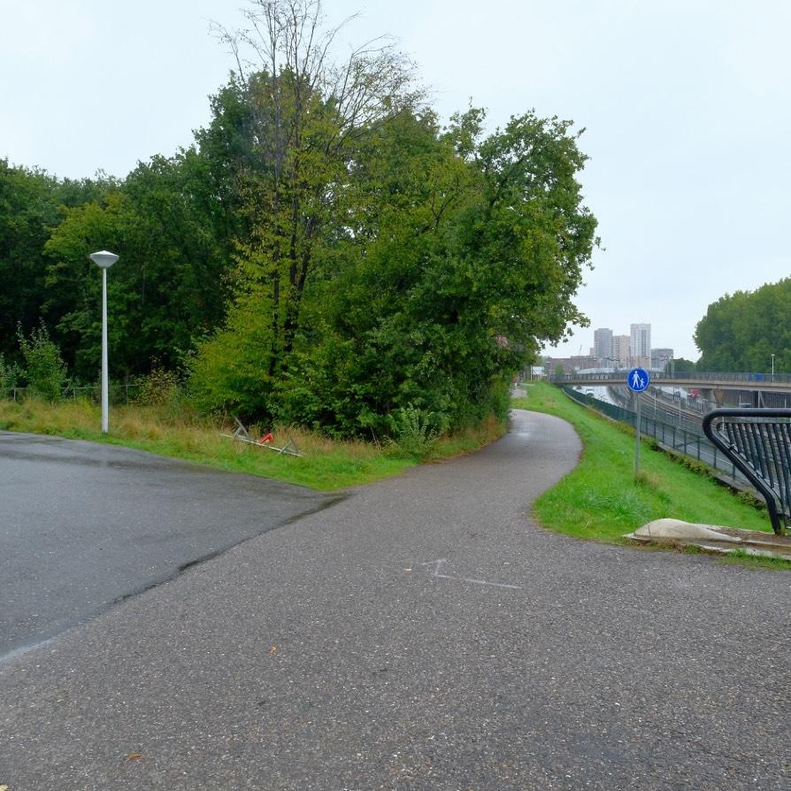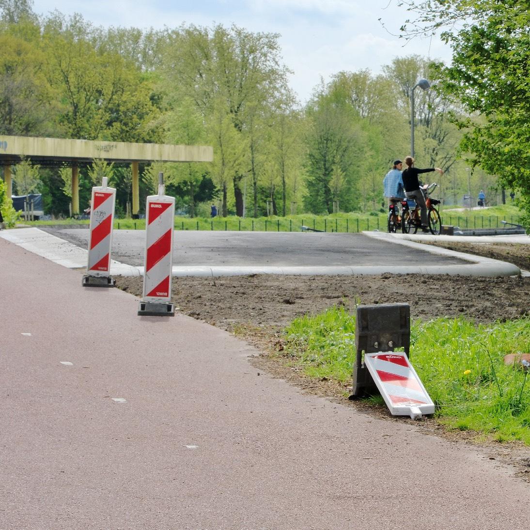 Kruising bij het nieuwe park-entree Buiksloot, gezien vanaf de Roze Tanker. De brommer komt van de Buiksloterdijk, rechts is het Zeedijkviaduct, en rechtdoor het ‘bouwwegfietspad’ naar Elzenhagen.