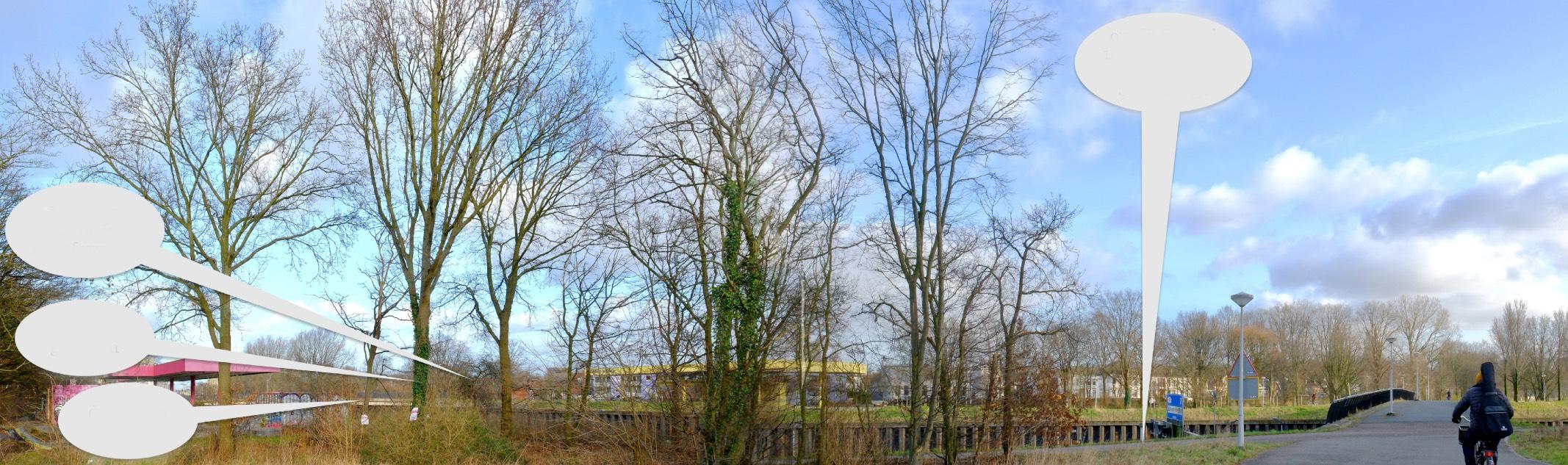 Op het kruispunt tussen de Eva Schalkbrug en de Roze Tanker kruisen twee hoofdroutes: (1)van Elzenhagen naar de pont (boven). Fietsers maken een wijde bocht. Daarom pleit de damesbende voor behoud van de wijde aansluiting. (2) van de zevenster bij IJskoud de beste over de Eva Schalkbrug (onder).