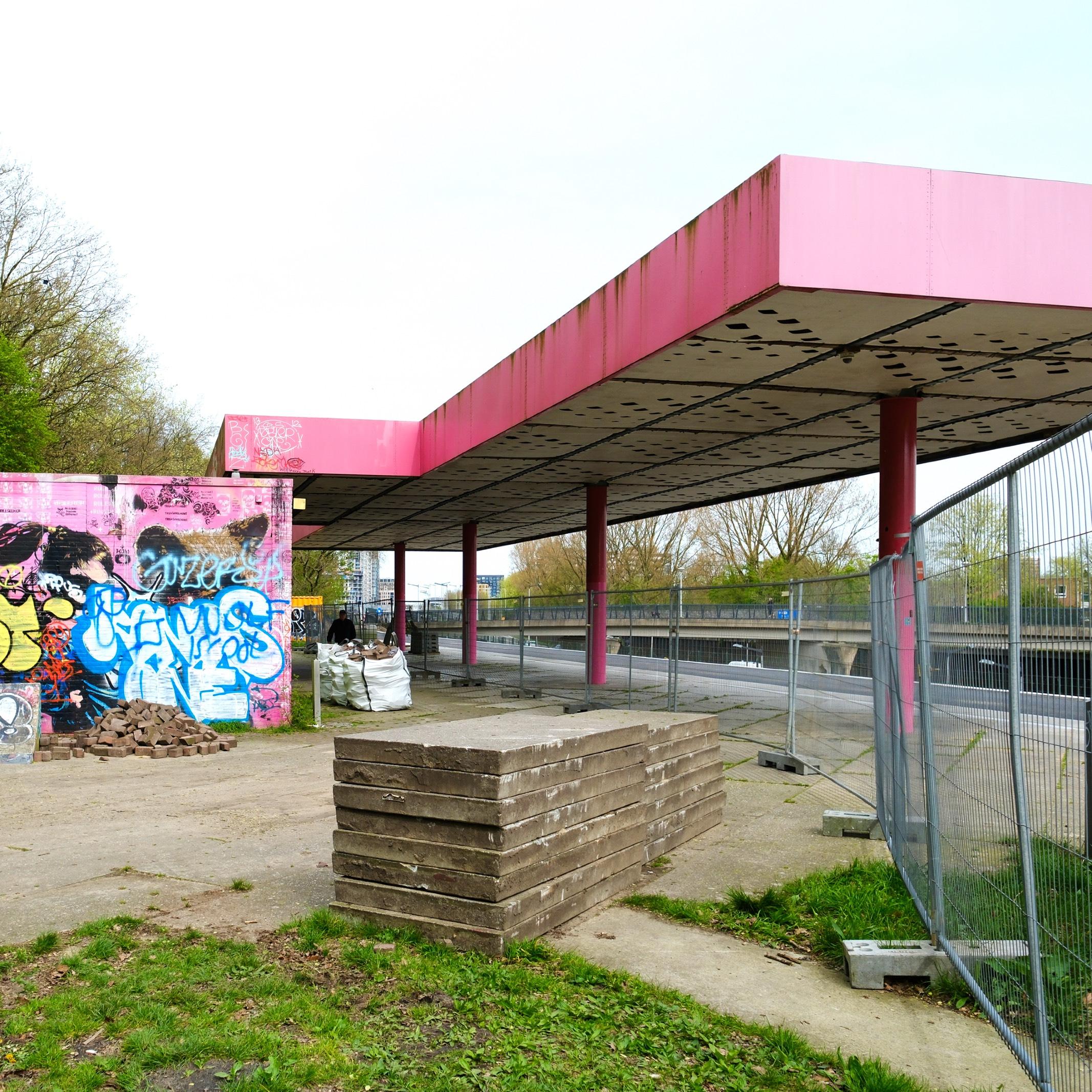 Achterkant van het tankstation dat nu de Roze Tanker is. De struiken stonden tot aan het gebouw. Op de foto is te zien dat de struiken zijn omgezaagd; dat was voor de make-over van het BP-gebouwtje tot Roze Tanker, naar ontwerp van de kunstenaar Sophie Valla. Daar hoorde een pad achter de tanker bij. Foto van 2009.