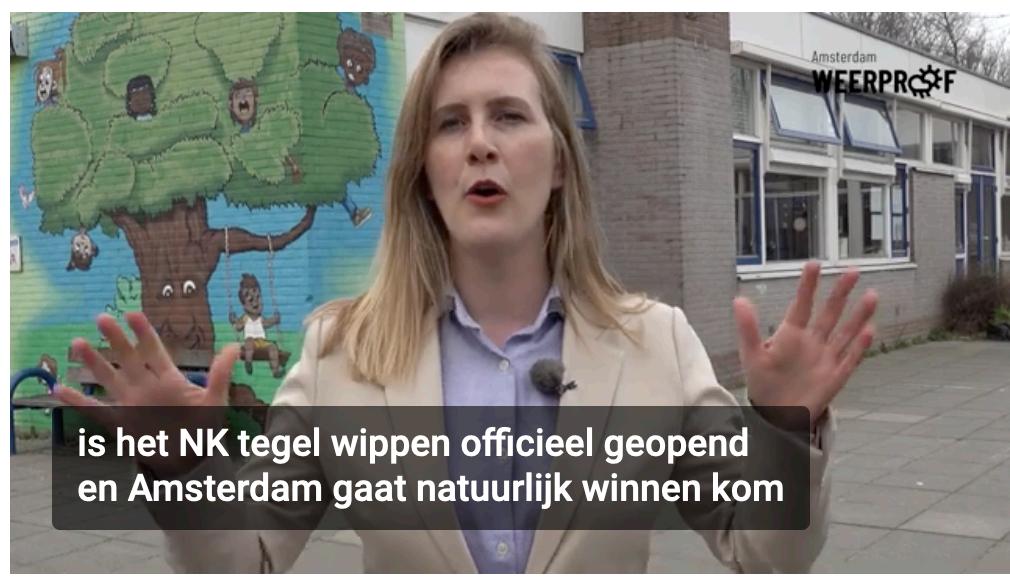 In een filmpje op Youtube op het schoolplein van basisschool de Kinderboom, opende wethouder Melanie van der Horst het NK-tegelwippen met de woorden: “Amsterdam gaat natuurlijk winnen. Kom op!”