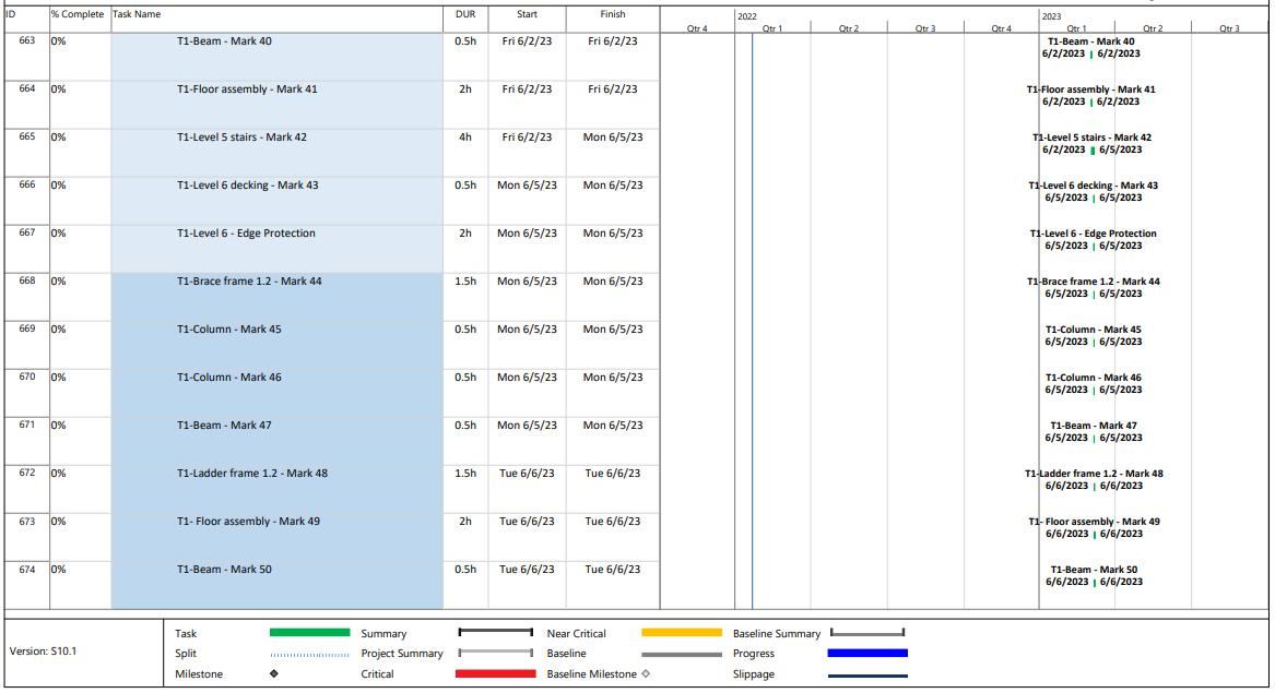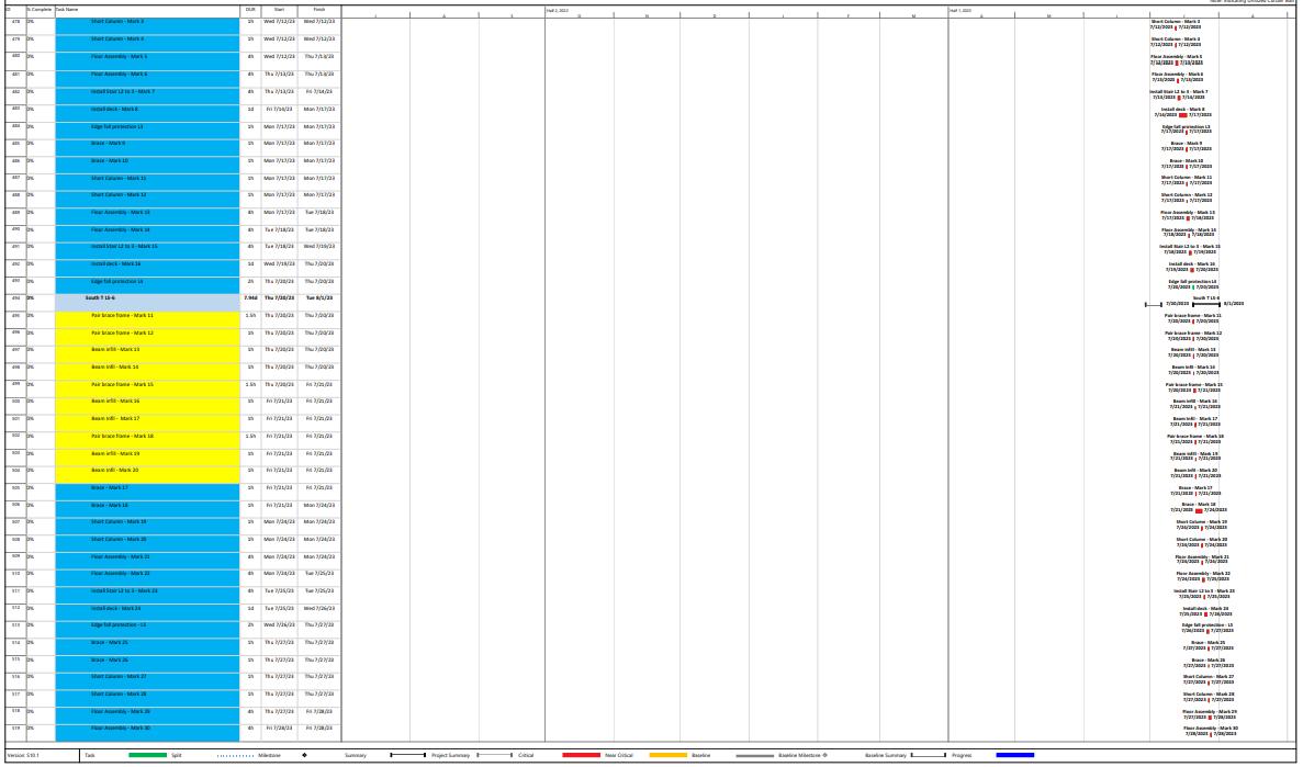 Now, with this new configuration the schedule is also modified as their main components come with a lot of parts assembled prior tower installation. According to the site trades, and the estimating team collaboration, the estimated time of installation for these frames is around 2 – 3 hours. The new version full schedule can also be found in Appendix C. Some value differences change other required assembly process that the previous design had. For instance, the original schedule showed the deck installation as a 1-day process. As several of the pieces are included in these components, already welded and assembled, it is normal that in the updated schedule this process is may faster, For the deck installation, the contour support beams for the landings and connexion to the deck and adjacent frame come already installed, which saves installation time to an overall of 0.5h as shown in Appendix B A similar case can be observed for the stairs installation where the current plan shows a time between 4 hours and 1 complete workday, the proposed plan includes a reduced and constant time of 4 hours for the stair’s installation throughout the building.