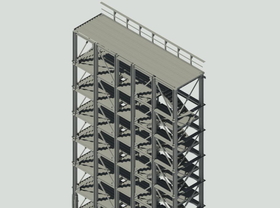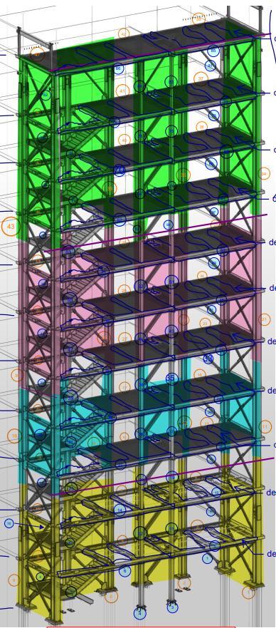 Each of these towers is composed by the mostly by the same elements, meaning same number of braces, stairs, floor decks and major columns assemblies. The initial grouping of elements was analyzed and determined by the way it can be welded together and then stacked as prefabricated modules efficiently.