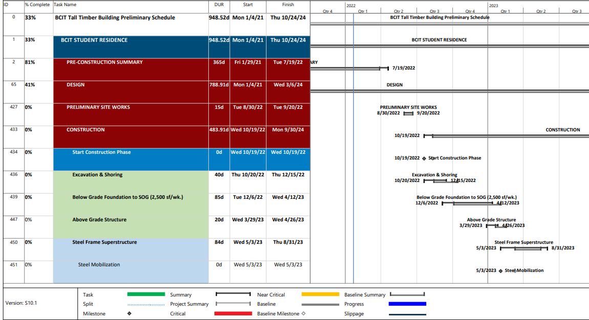 The difference is mainly focussed on scheduling and in terms of budget the Cast in place has a reduced cost, that allows construction process to have additional equipment. For instance, the Version 1 Cast in place overall construction includes an additional mobile crane on its exterior side. This comparison also helps us to outline the differences. The concrete erection goes floor by floor, while the mass timber erection has CLT Cores that are erected three storeys at a time. The overall time difference is the time frame where the construction duration of the concrete construction is 25 months, while the mass timber construction is 27 months as Figure 2 shows.