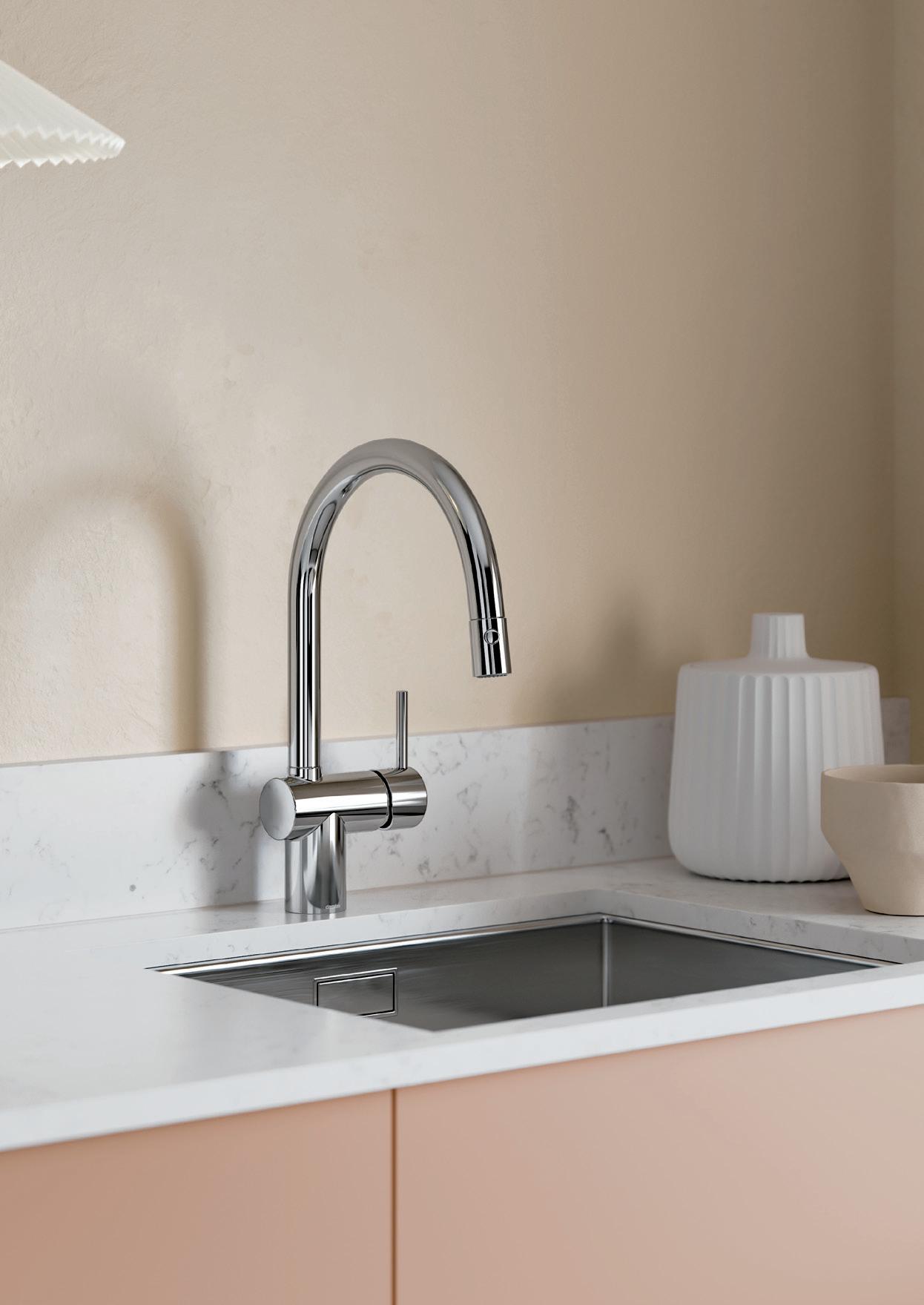 Joustava letku puhdistaa altaan kätevästi. Ulosvedettävä suutin on jopa 40 cm pitkä. Suutin liukuu itsestään takaisin paikoilleen.