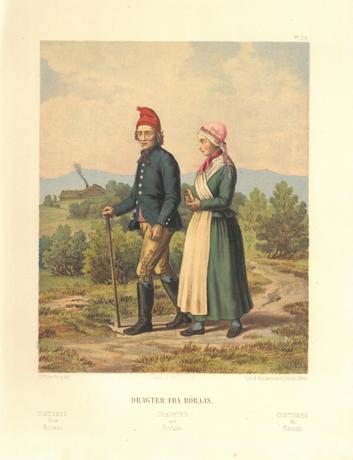 141. (RØROS). (ECKERSBERG). Dragter fra Röraas. Christiania. 1852. Udgivet af Chr. Tönsberg. Originalt farvelitografi. Arkets størrelse : 24,5 cm X 33 cm. Rent og fint eksemplar.