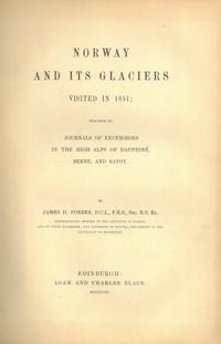 28. FORBES, James : Norway and its glaciers visited in 1851 ; followed by journals of excursions in the high alps of Dauphiné, Berne and Savoy. Edinburgh. 1853. Adam and Charles Black. Leks8vo. Originalt shirtingbind med blinddekor på ryggen og deklene. Rebacked med bruk av den originale ryggstripen. xxiv, 349 s. Med 2 farvetrykte kart hvorav det ene er foldet. 10 farvelitografier, tresnitt i teksten.
