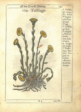 125. (HESTEHOV). PAULLI, Simon : Tussilago. København. 1648. Liten 4to. Originalt tresnitt med senere håndkolorering. Med passepartout i enkel ramme. Fra Simon Paulli : Flora Danica. Trykt hos Plantin i Antwerpen. Paulli, (1603-1680), dansk lege og naturforsker. dam77546