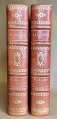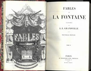 32. (GRANDVILLE). LA FONTAINE : Fables de (...). Illustrées par J. J. Grandville. Nouvelle édition. I-II. Paris. 1839. 8vo. H. Fournier Ainé, Éditeur. 1800-talls røde skinnryggbind med opphøyde ryggbånd og ryggforgylling. Helt gullsnitt. Marmorerte dekler. Gravert frontispiece. (2), XXVIIII, 292 ; 312 s. Illustrasjoner utenom pagineringen. Meget pent sett. dam66023