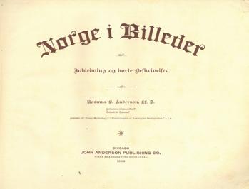 7. ANDERSON, Rasmus B. : Norge i Billeder med Indledning og korte Beskrivelser af (...), forhenværende amerikansk Gesandt til Danmark. Chicago. John Anderson Publishing Co. 1899. Tverr4to. Originalt grønt helshirtingbind. Upaginert. Gjennomillustrert med fotografier. Bindet med små bruksspor.