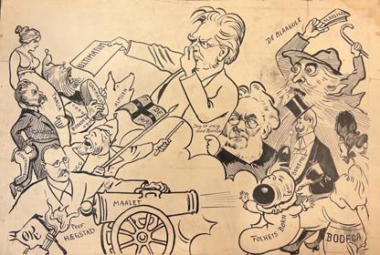 128. (KROHN, Olaf). Et satiriske bilde, kanskje i forbindelse med språkstrid. Lett gjenkjennelige er Garborg, Ibsen og Bjørnson. Signert O. K. Uten år. (Omkring 1899). Original tusjlavering. Størrelse : 50 cm X 33,5 cm.