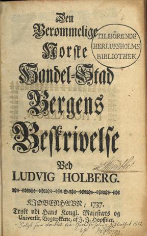 47. HOLBERG, Ludvig : Den Berømmelige Norske Handel-Stad Bergens Beskrivelse. Ved (...). Kjøbenhavn. 1737. Trykt udi Hans Kongl. Majestætrs og Universit. Bogtrykkerie af J. J. Høpffner. 8vo. 1700-talls skinnryggbind med svakt opphøyde ryggbånd, blinddekor på ryggen. (8), 311, (1 blank) s. Ehrencron-Müller X, s. 251-55. Liten skade ved nedre kapitél. Stemplet “Tilhörende Herlufsholms Bibliothek”. Navn i eldre hånd på tittelbladet - G. Munthe. Nederst på tittelsiden - “Solgt som doublet fra Herlufsholms Bibliothek 1812”. dam77597