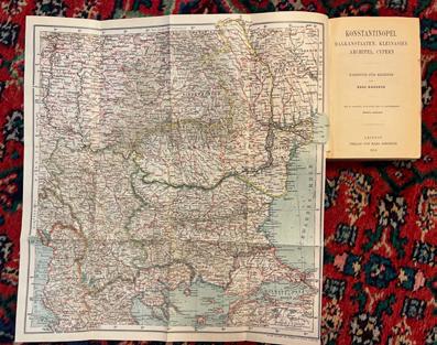 43. (HELLAS). BAEDEKER, Karl : Grèce. Manuel du voyageur. Avec un panorama d’Athènes, 17 cartes, 32 plans de villes, de musées etc. et 2 planches. Leipzig. 1910. Verlag von Karl Bædeker. 8vo. Originalt rødt helshirtingbind. CII, 468 s. Med tallrike foldeplansjer. Med et farvetrykt foldekart i lomme bak i boken. Meget pent eksemplar av en uvanlig Baedeker. dam77619