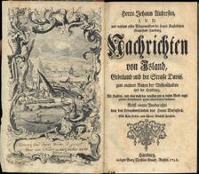6. ANDERSON, Johann : Nachrichten von Island, Grönland und der Strasse Davis, zum wahren Nutzen der Wissenschaften und der Handlung. Mit Kupfern, und einer nach den neuesten und in diesem Werke angegebenen Entdeckungen, genau eingerichteten Landcharte. Nebst einem Vorberichte von den Lebensumständen des Herrn Verfassers. Mit Kön. Pohln. und Churf. Sächsis. Freyheit. Hamburg. 1746. Verlegts Georg Christian Grund, Buchdr. 8vo. Noe senere skinnryggbd. med marmorerte dekler. Gravert frontispiece. (30), 328, (6) s. 4 foldede kobberstikk. Med et kobberstukket foldekart. Første utgave.