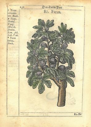 121. (FIKEN). PAULLI, Simon : Ficus. København. 1648. Liten 4to. Originalt tresnitt med senere håndkolorering. Med passepartout i enkel ramme.