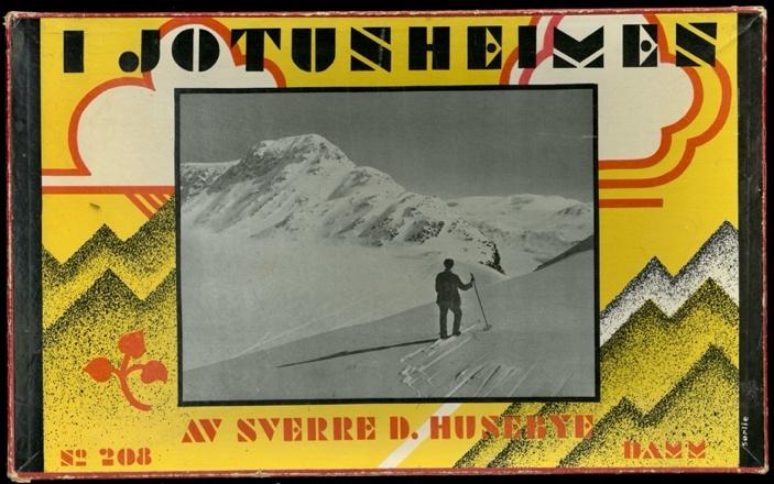 (SPILL). I JOTUNHEIMEN AV SVERRE D. HUSEBYE. Uten år (ca. 1930), Oslo. I original dekorert eske. Med seks brikker - i form av turgåere, dekorert spillebrett, en terning samt spilleregler. Brettet er i tre deler, men kan enkelt repareres. Et morsomt spill i relativt god stand.