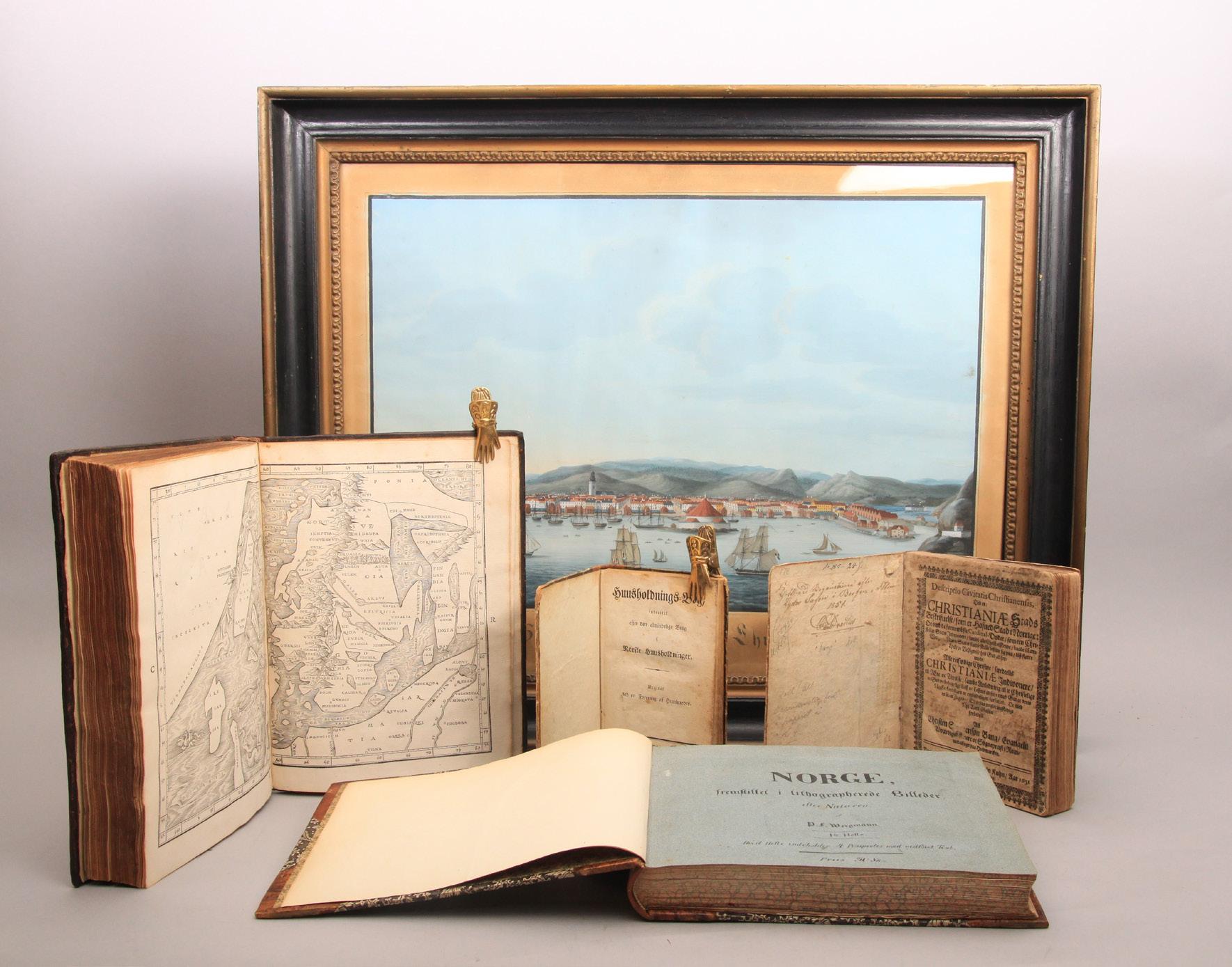Wergmann, P. F.: Norge fremstillet i lithographerede Billeder efter Naturen. Billederne ere ledsagede med beskrivende Text. Første (og) Andet Bind. Christiania, Paa forfatterens Forlag, 1836-37. Tverr-4to. Med 48 og 36 stentrykk. I tillegg bilagt med 8 stentrykk, hvorav 3 tonede og 3 kolorerte. Tekst av P. Chr. Asbjørnsen og Bernt Moe. Bundet i ett senere skinnbind med gulldekor på ryggen og rødt skinn tittelfelt. Orig. foromslag til 1. hefte medbundet. Svakt brunettet, ellers et meget fint eksemplar.
