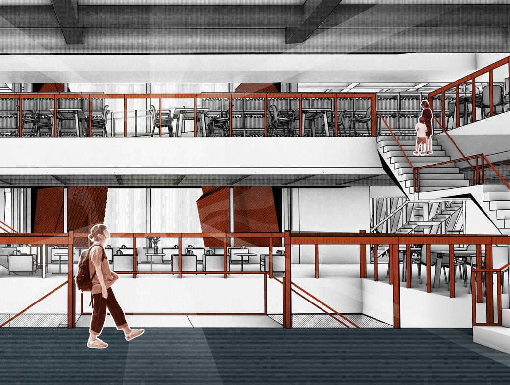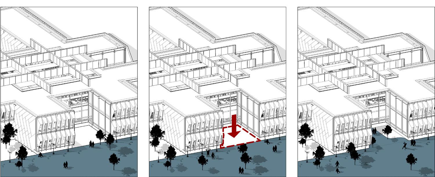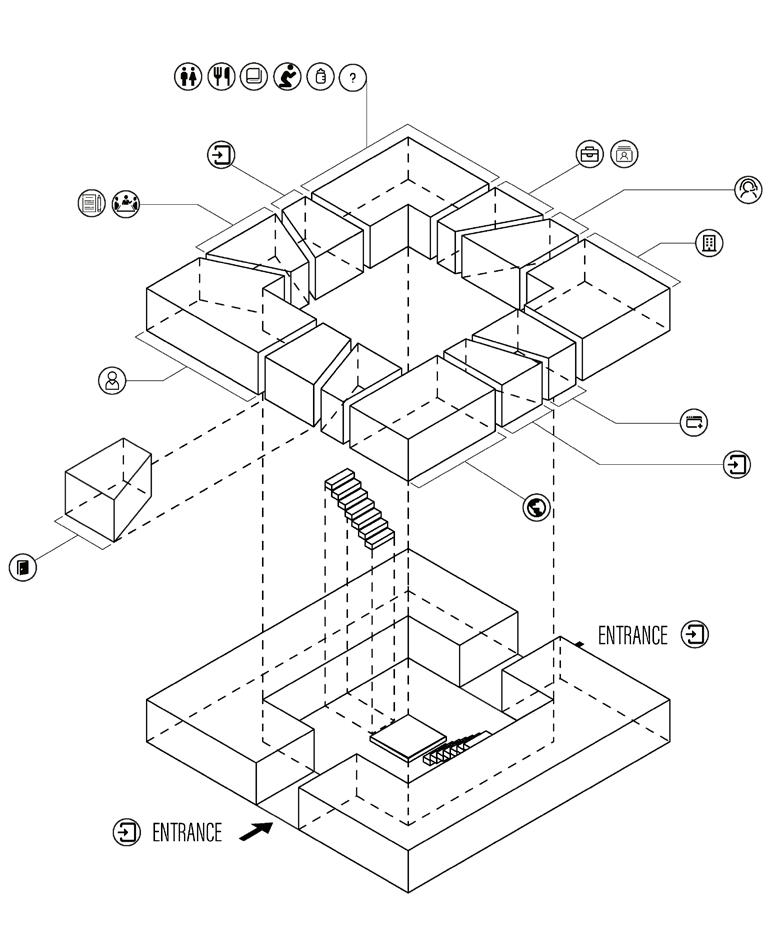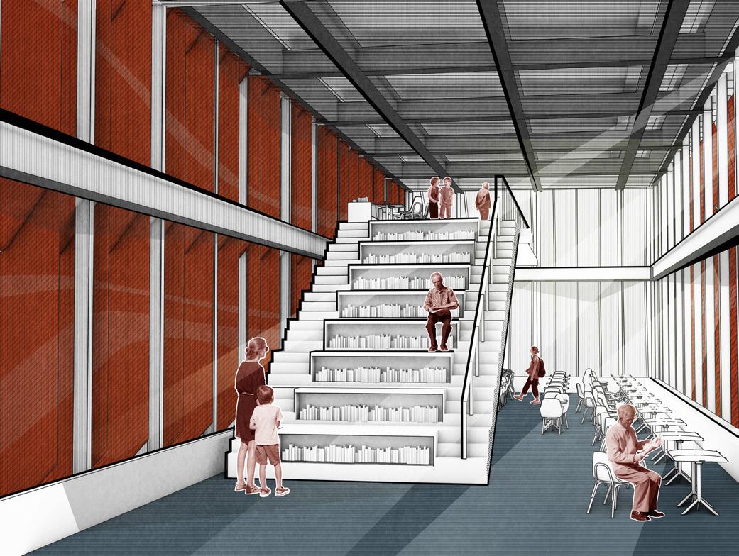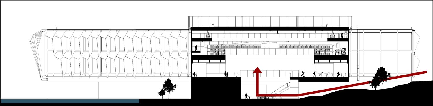 The library is built on a 10-foot-high hill. I arranged the entrance in the grid-gap, so that pedestrians can follow the hillside to enter the library, thus perfectly integrating the building with nature.