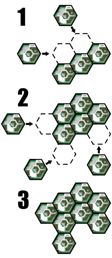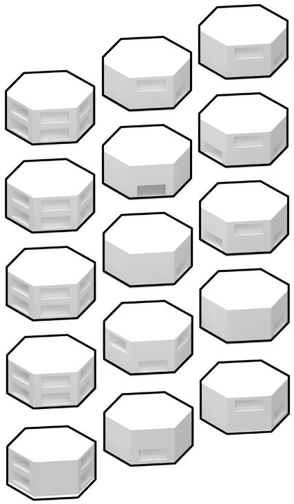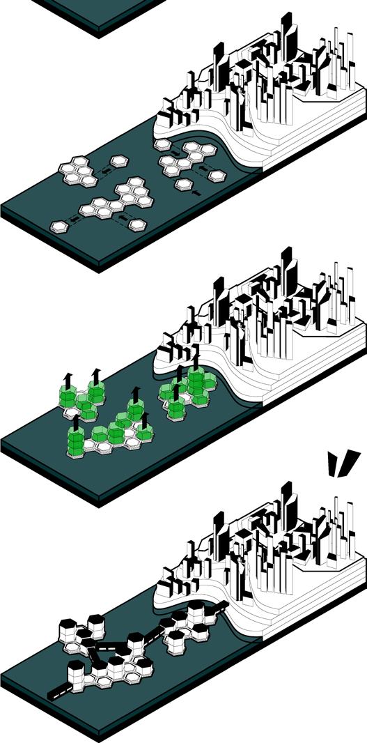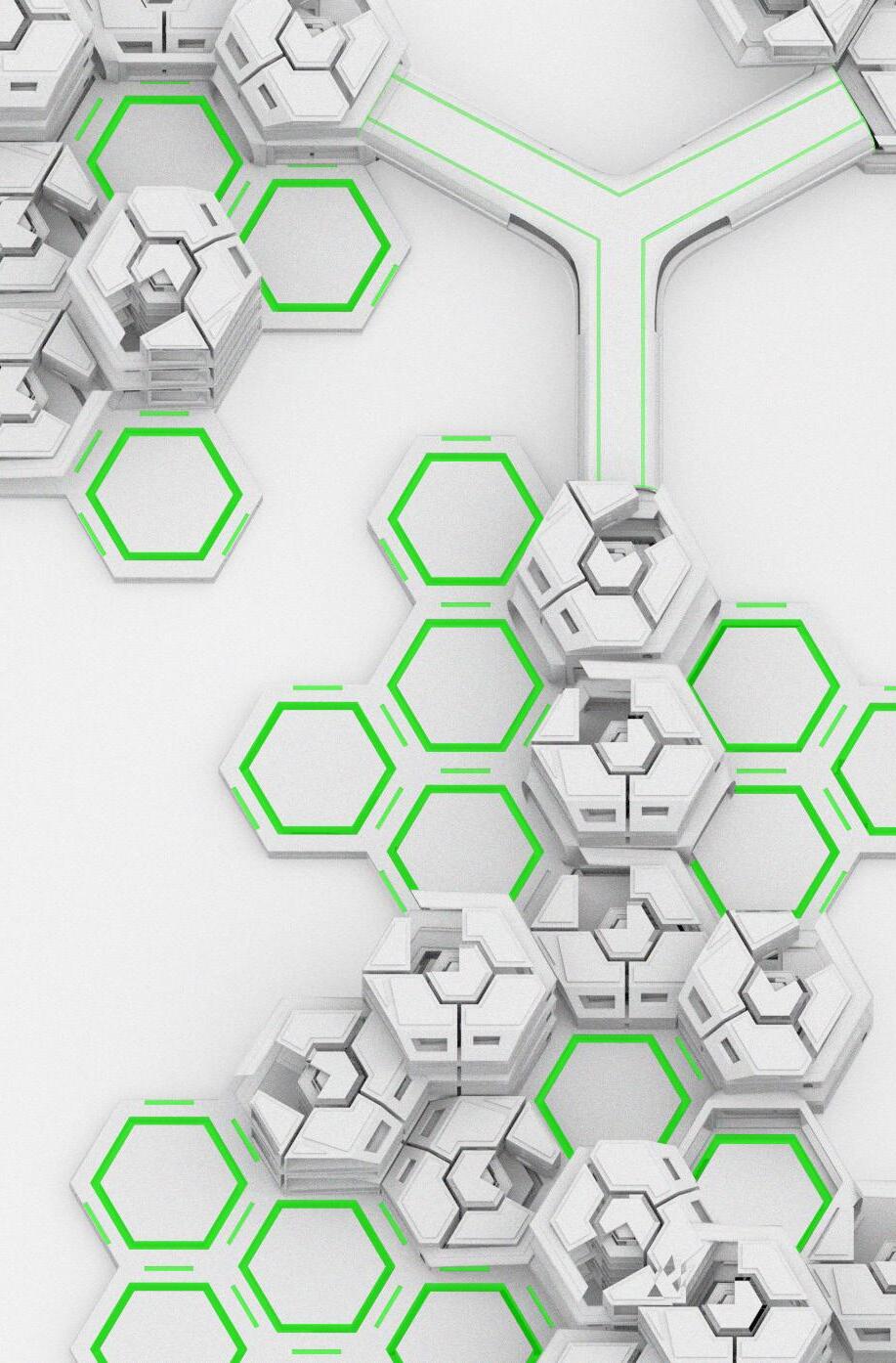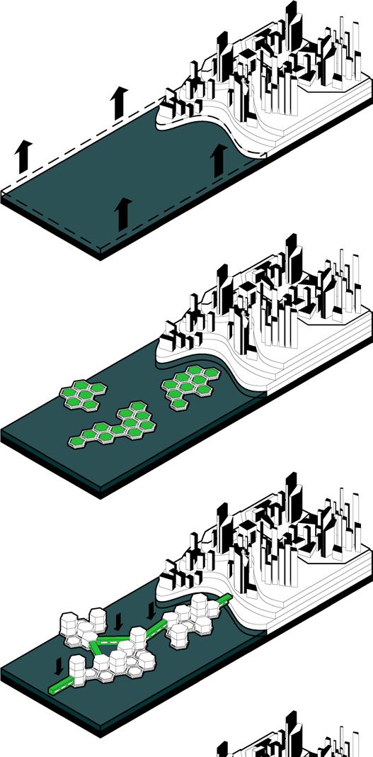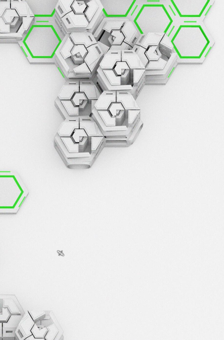 The cluster will be built above the hexagonal platform to provide living spaces and form aggregation.
