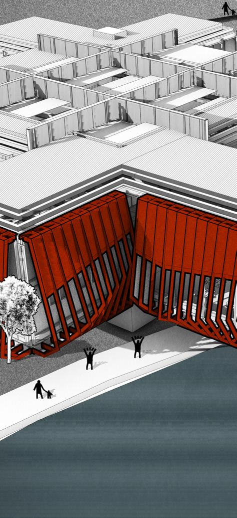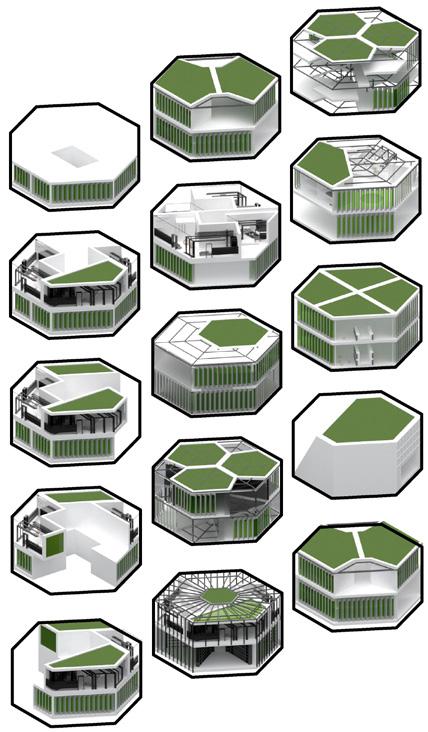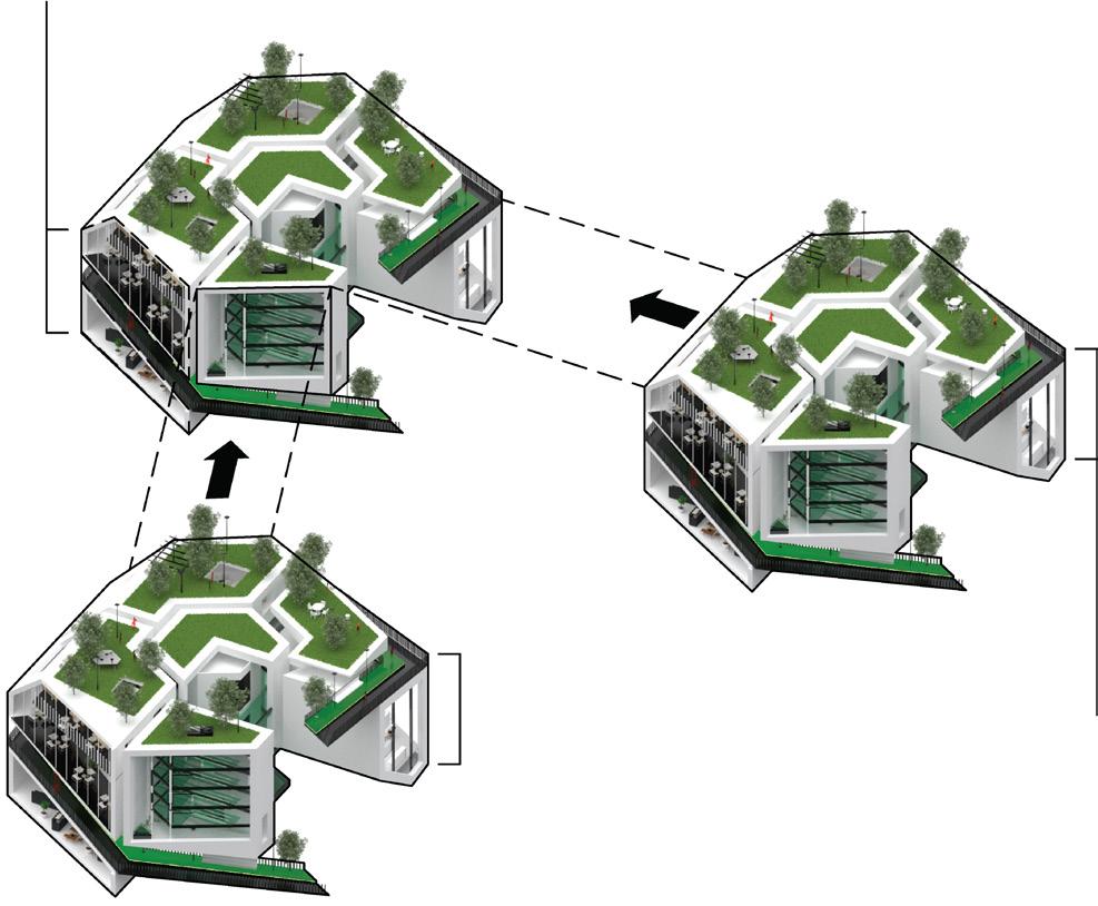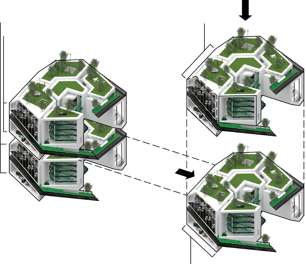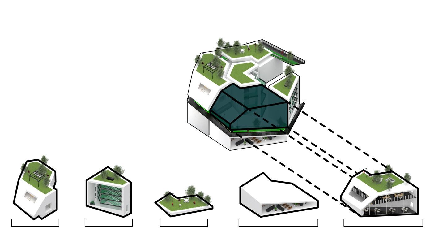 PRT will be formed as a transportation system between the cluster and form an entire community. 15 units with different combinations were generated and combined into one. It includes facilities for essential needs and new energy for suitability development.