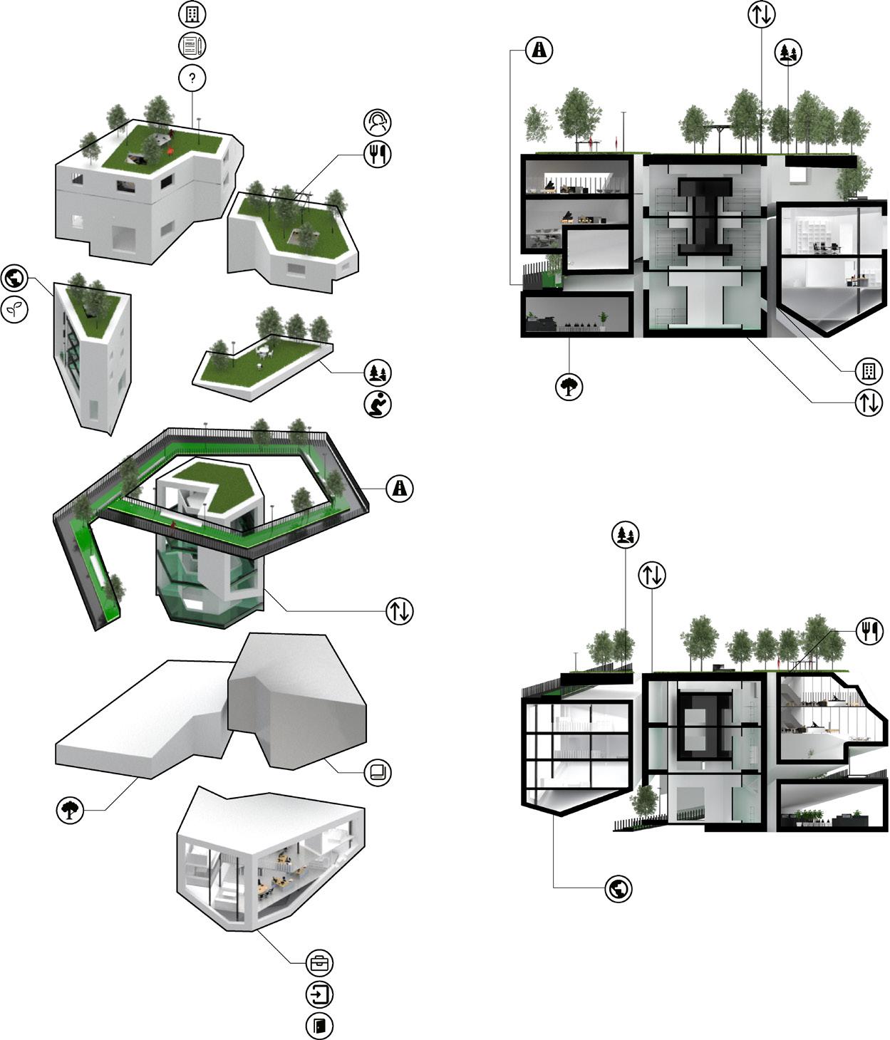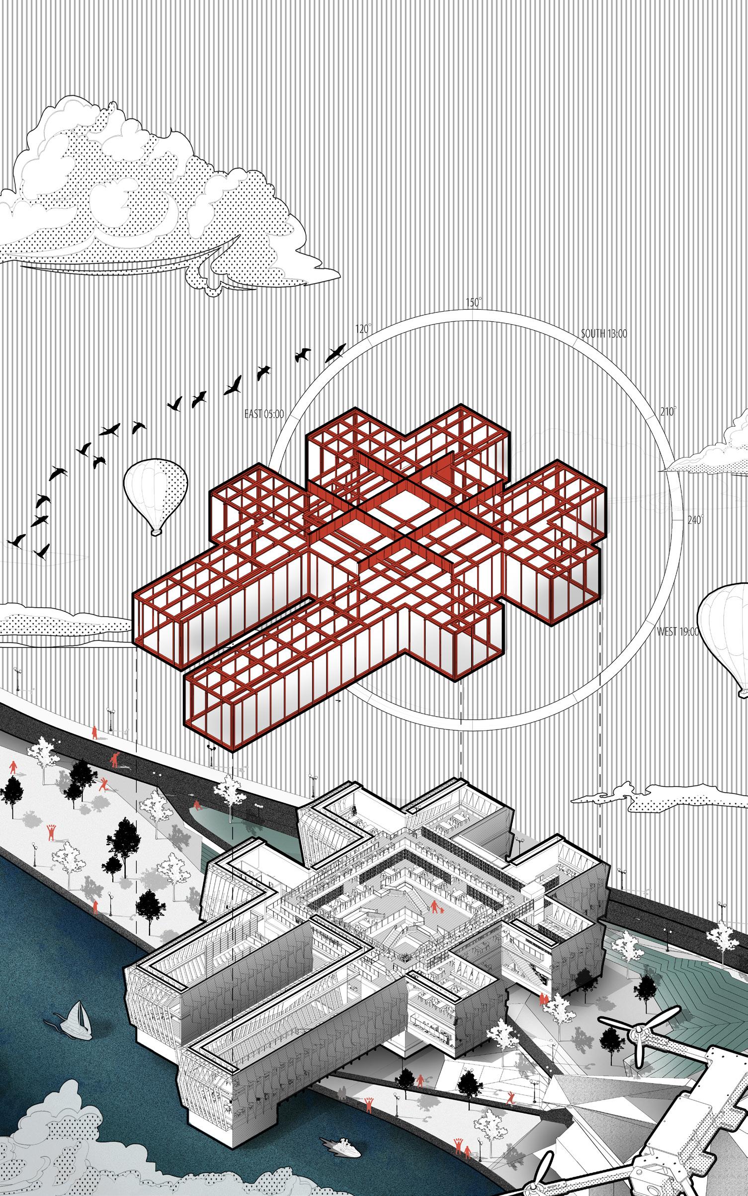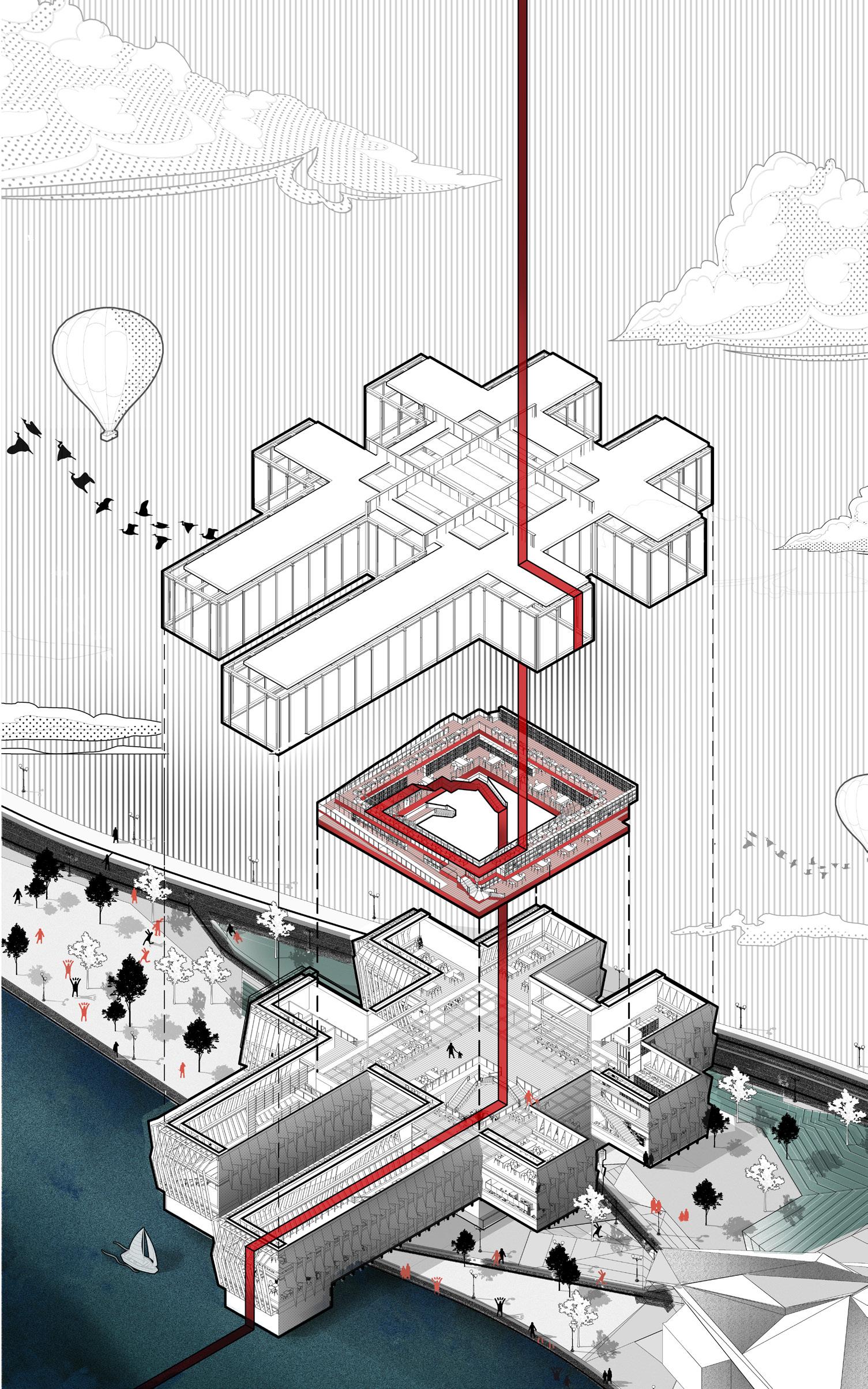 The upper and lower connection design allows the development vertically and horizontally, but the spiral pedestrian passage makes it the initial shape of the three-dimensional city.