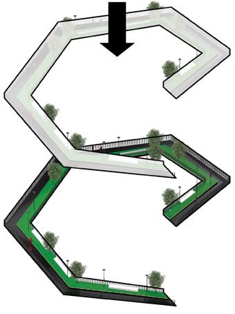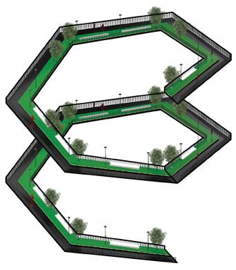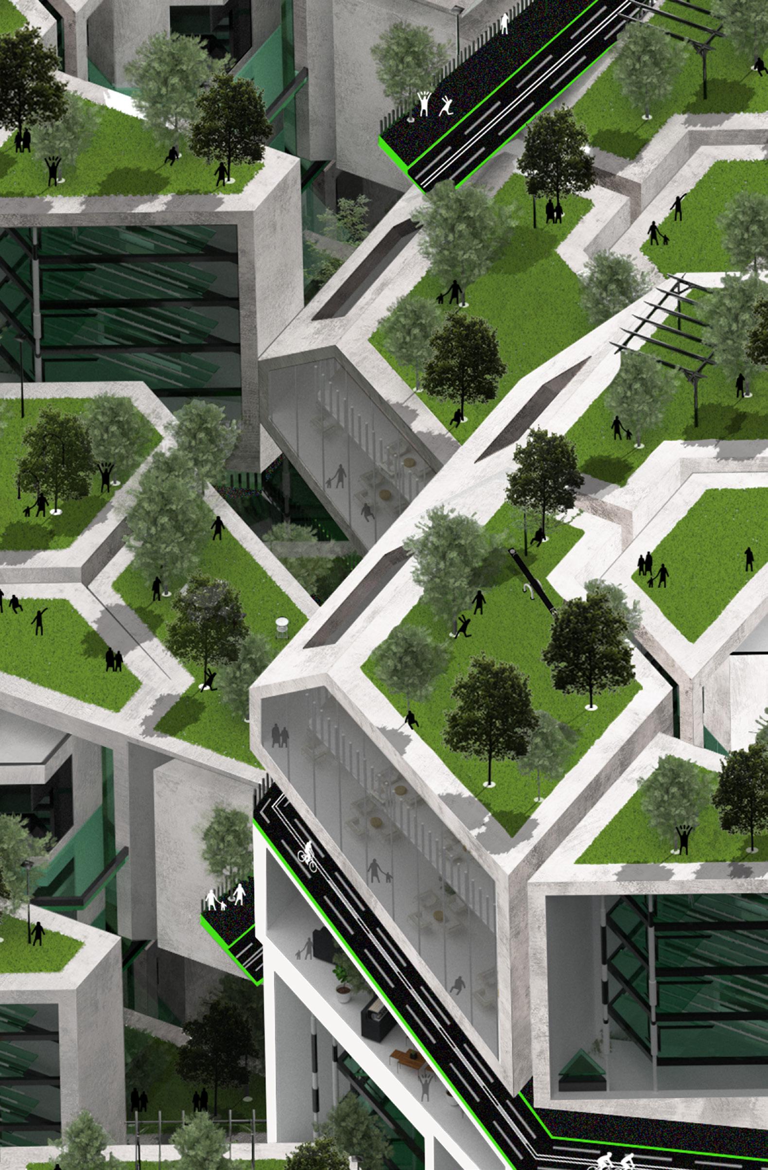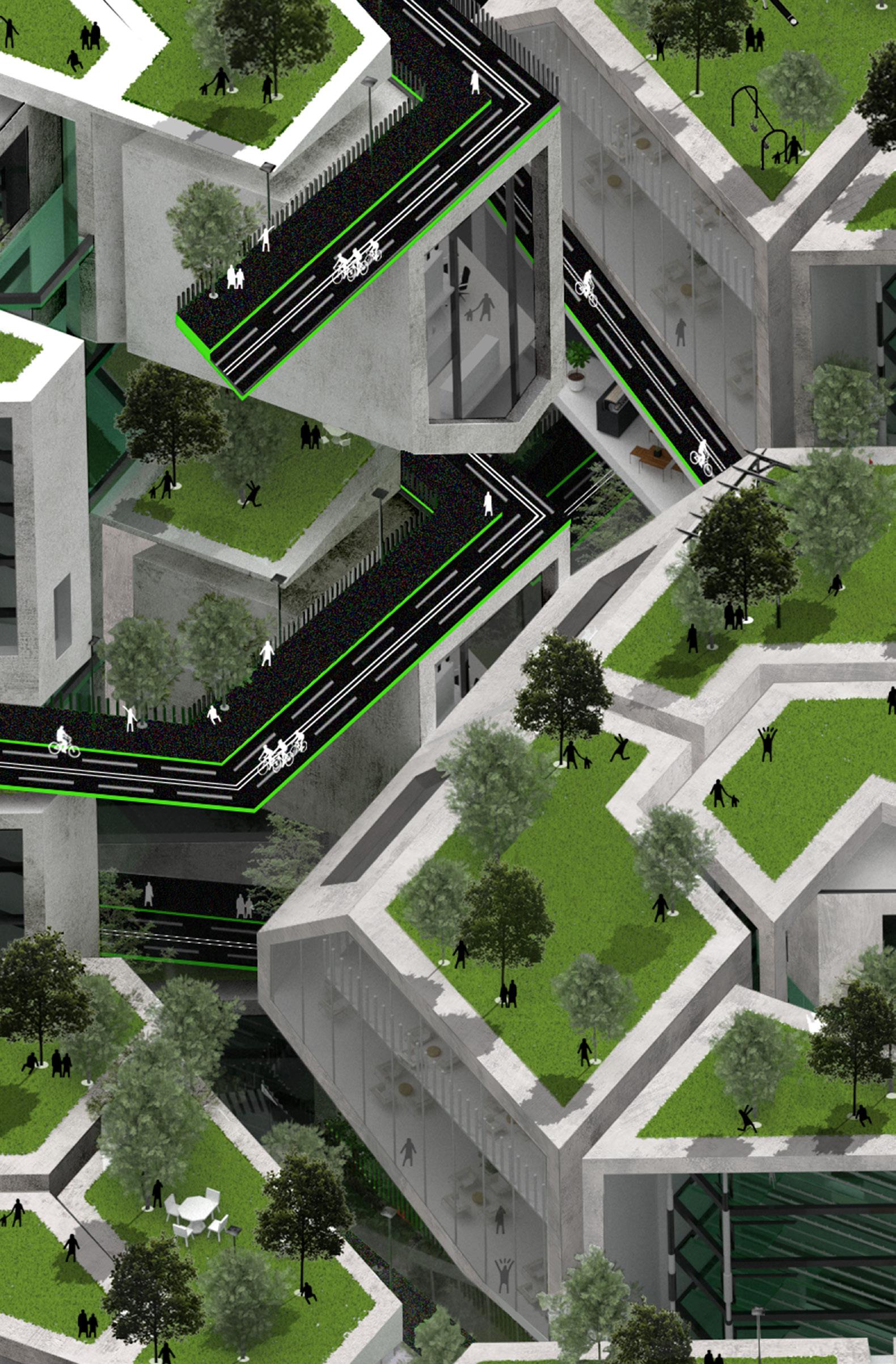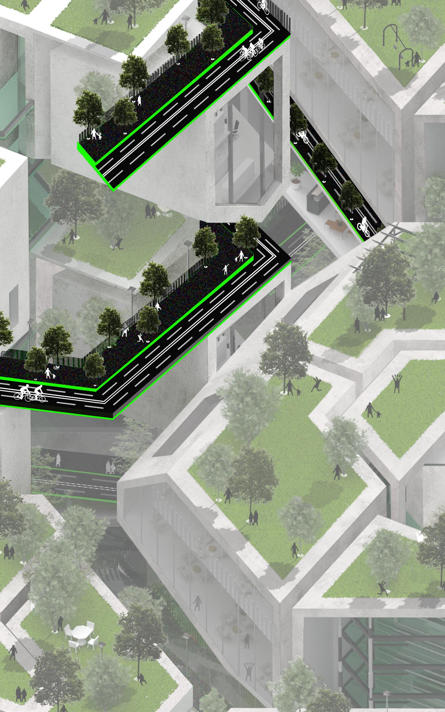 The green environment at the platform's top allows pedestrians to relax while providing enough oxygen.