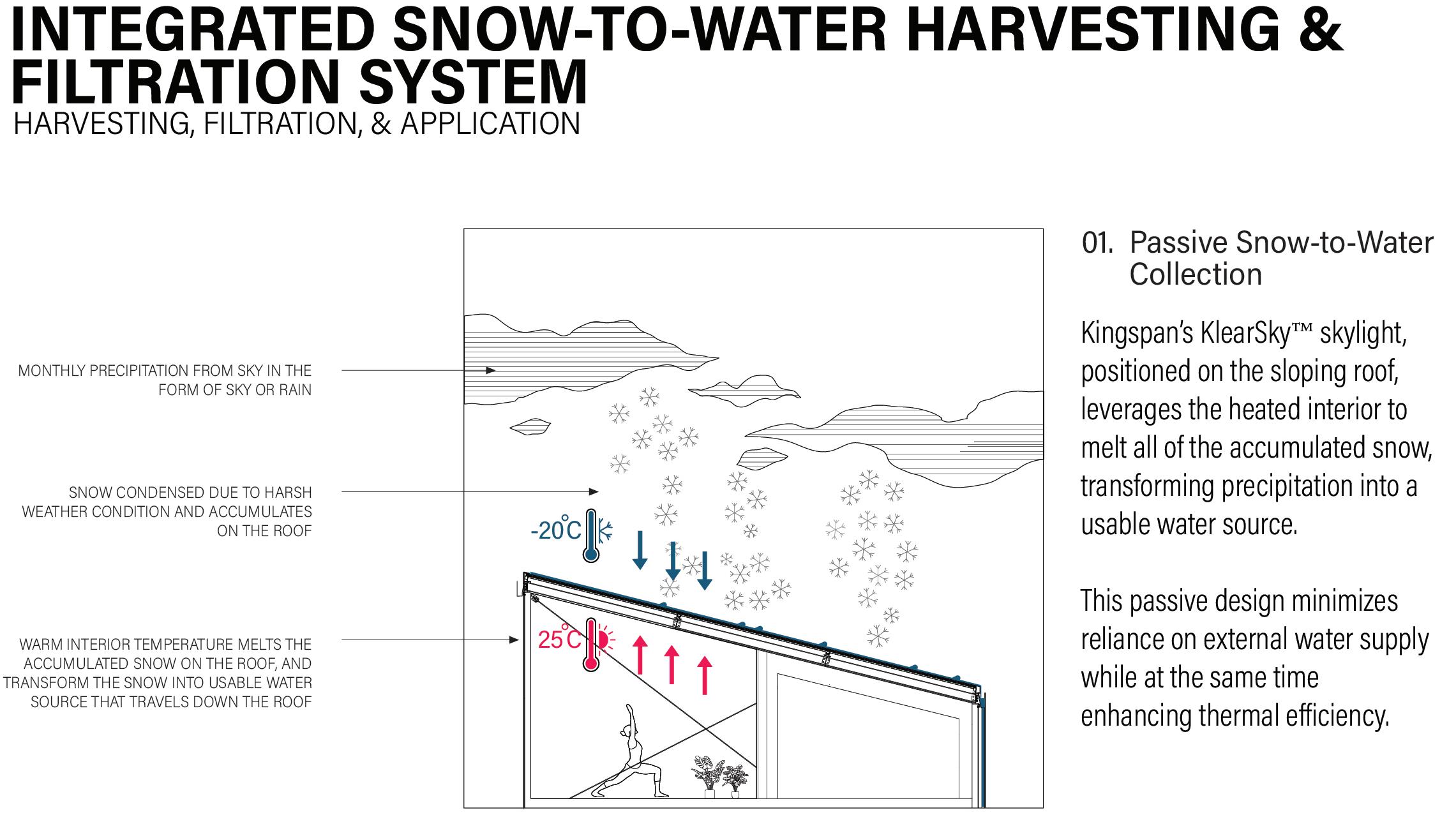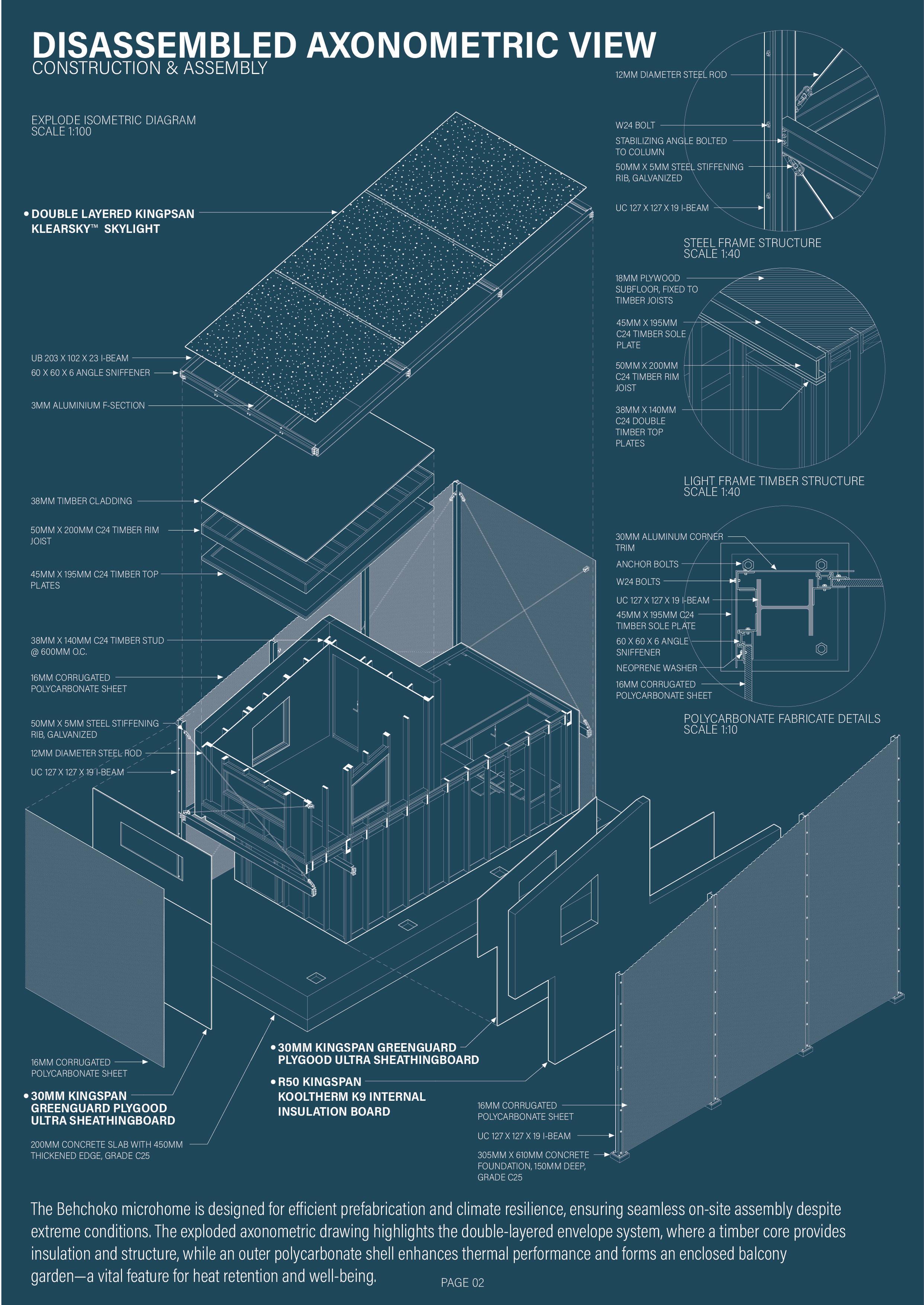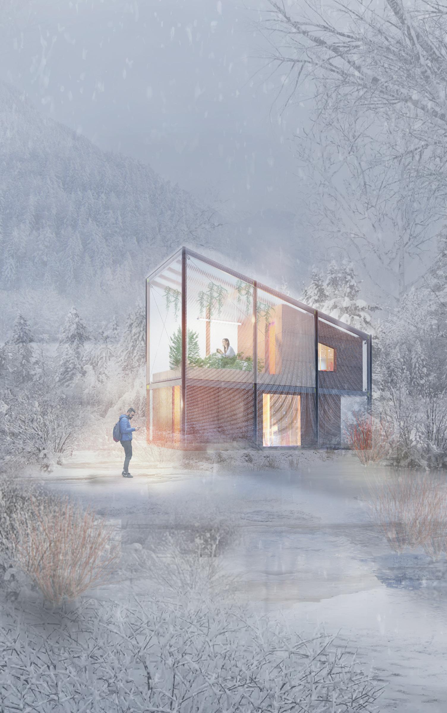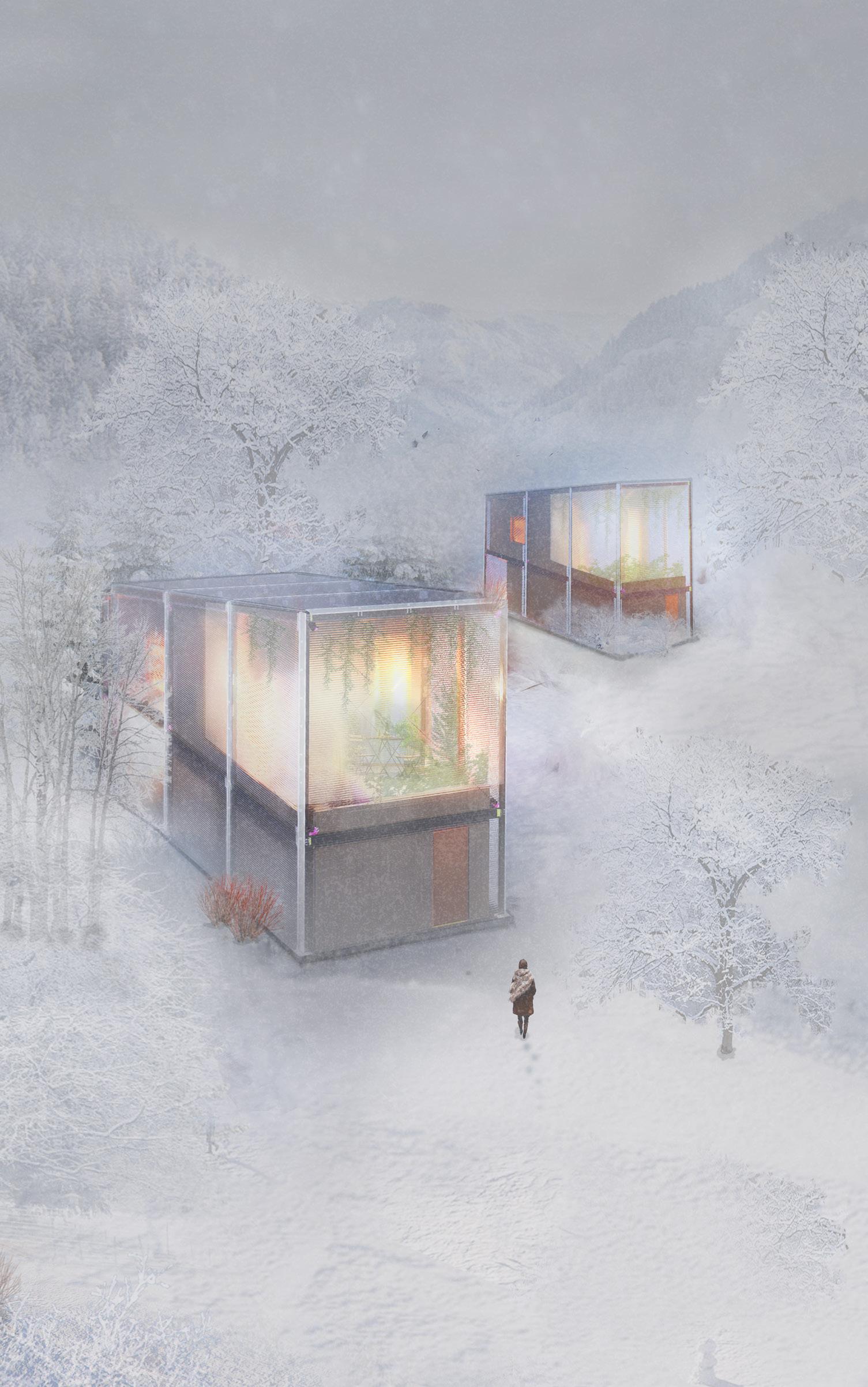 Inspired by greenhouse structures, the microhome features a double-layered envelope system, where an outer polycarbonate shell encases a timber core. This design passively retains heat and creates an indoor balcony greenhouse, allowing residents to experience natural greenery even in the depths of winter. The home fosters a balance between warmth and exposure to Arctic landscapes, mitigating the psychological effects of prolonged darkness.