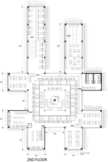 The grid design crisscrosses the interior spaces, making it easier for pedestrians to meet and communicate with each other.