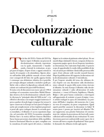 ra la fine del 2018 e l’inizio del 2019 ha ripreso vigore il dibattito sui processi di decolonizzazione culturale, espressione con la quale, riassumendo e banalizzando, s’intende la restituzione, ai proprî paesi d’origine, d’opere d’arte e oggetti sottratti in epoche di conquiste o di colonialismo. Questo almeno nell’ambito delle politiche museali: occorre infatti esser consapevoli del fatto che quella appena fornita è comunque una definizione riduttiva (la si potrebbe per esempio allargare andando a includere quelle politiche volte a ridurre la dipendenza culturale delle ex colonie nei confronti dei paesi dell’Occidente). Si tratta certo di discussioni non nuove: già nel 1996 il sociologo ed economista marocchino Mahdi Elmandjra riteneva che la decolonizzazione culturale sarebbe divenuta la “principale sfida del XXI secolo”, e in effetti lo è diventata: con sempre maggior insistenza s’è preso a parlare di modi, leggi e tempi per far tornare le opere conservate in Europa nei loro paesi d’origine (o anche più semplicemente ai loro legittimi proprietarî: si pensi alle opere trafugate durante la seconda guerra mondiale), e il dibattito s’è acceso soprattutto dopo che, nel novembre del 2018, l’economista senegalese Felwine Sarr e la storica dell’arte francese Bénédicte Savoy hanno presentato al presidente della repubblica francese Emmanuel Macron un report, compilato con la consulenza di molti esperti del settore, e intitolato