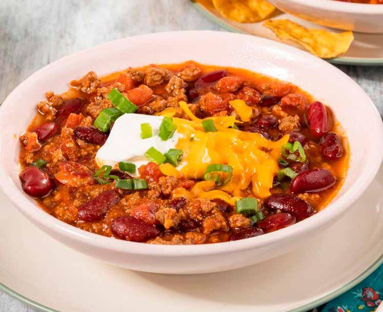 • Serve topped with cheese, sour cream, green onion, and corn chips.