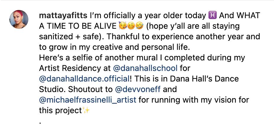 In addition to the above-mentioned individual shows, the establishment in 2017 of the Scattergood-Moore Artist-in-Residence Program was an important addition to the gallery program. Established with the donation of funds by alumnae artist Anne Leone ’77, and further developed each year, the program has helped to bring a diverse group of artists to our community, often living on campus, working with students, and contributing work to the school. Those included: our first artist, Mae Beatty; multi-media artist Alia Ali; painter and installation artist Dinora Justice; mural painter Mattaya Fitts; and our most recent resident artist, painter Yu Cheng. Although each artist was memorable in their own way, Mattaya Fitts stands out for the fact that, not only did she create—with the help of students and other members of the community— three substantial murals in February of 2020 (a permanent dance-inspired work in the Shipley Center Dance Studio, a large canvas promoting student activism, and a beautiful butterfly mural for the greenhouse), but she did it all before the approaching pandemic shut down the school and changed our world in an instant.
