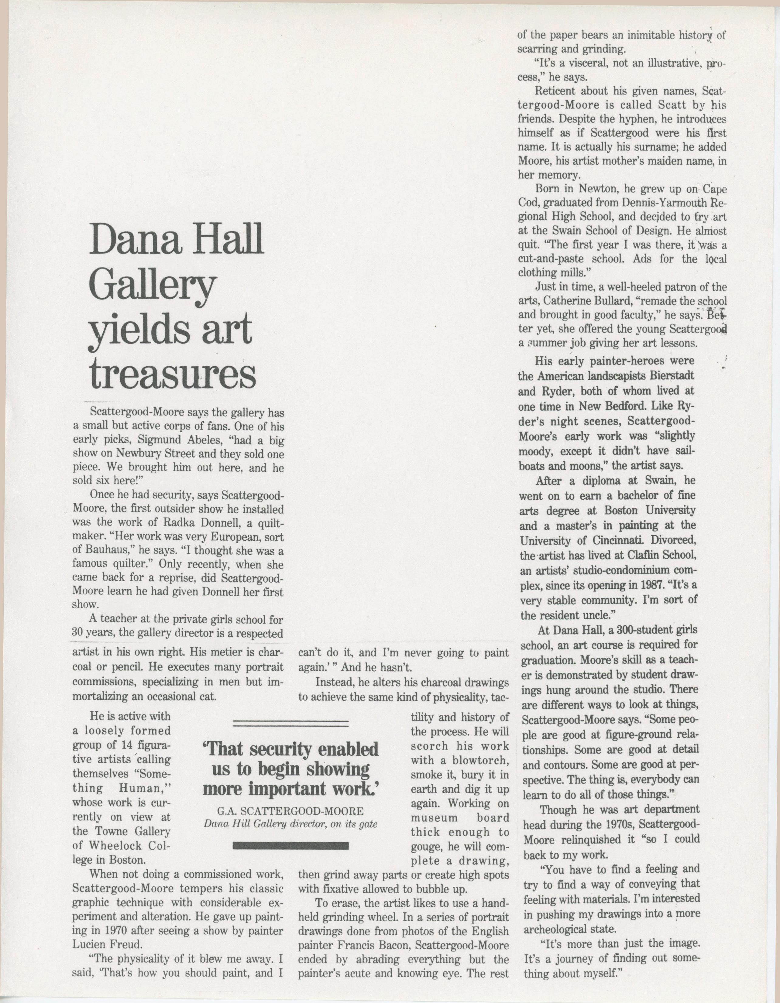 “In 1975, while Scatt (G. A. Scattergood-Moore)was Head of the Art Department, the Dana Art Gallery was established with a gift from class of 1949 during their 25th reunion. The Gallery allowed the visual arts, with the emphasis on women’s art, to have a prominent role at Dana Hall.”