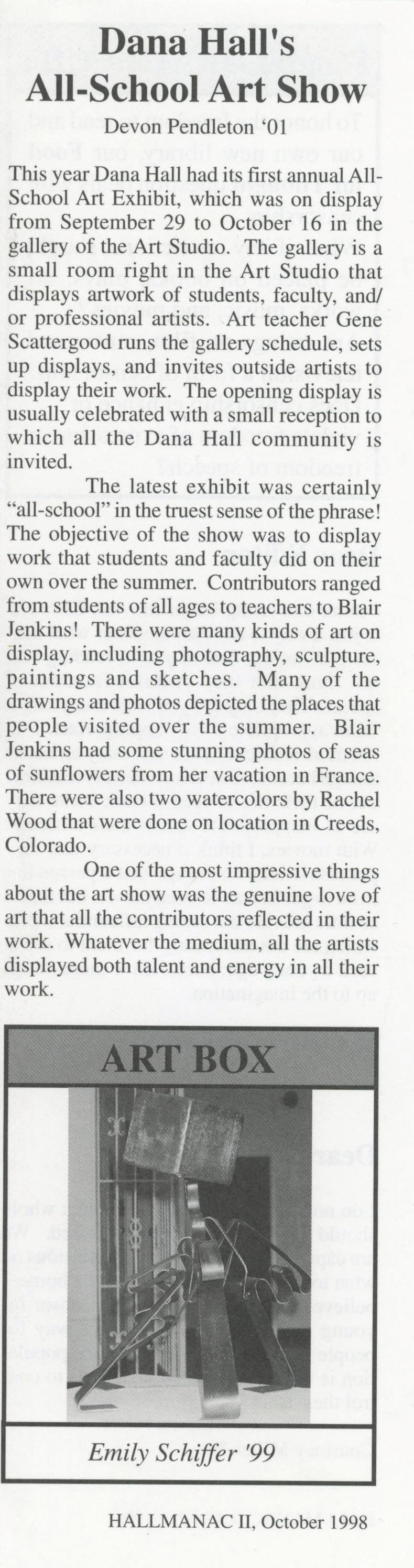 The Dana Hall Art Gallery, established in 1975 by Gene Scattergood (aka G.A. Scattergood-Moore, but known affectionately to his many colleagues and former students by his nickname “Scatt”) has been a fixture in the culture of the Dana Hall School for 50 years. It has been host to scores of exhibits, featuring hundreds of artists, and visited by thousands of students and campus visitors. It has featured every genre of art, from painting, drawing, and photography, to contemporary craft and digital art, to sculpture and installation. The artists who have exhibited here range from alumnae, faculty, and student artists, to campus children, Bostonbased and regional artists, to nationally and, in some cases internationally, known contemporary artists. It has been graced by poets, musicians, dancers, writers, makers, and scientists. It has had two physical spaces; first in an under-used and oddly shaped former middle-school snack room that blossomed over the course of decades with each passing exhibit, to its current location, a bright, windowed, modern space in the recently renovated Classroom Building. It has spanned two different centuries, and has occasionally expanded its exhibits into other campus spaces, including the hallways, the library, the greenhouse, courtyard, and elsewhere. It has witnessed and reflected the changing artistic styles, culture, population, and technology during those 50 years, displaying the creative journey, the countless studio hours, and the diverse personal inspiration of the many artists who have placed their artwork within its walls.