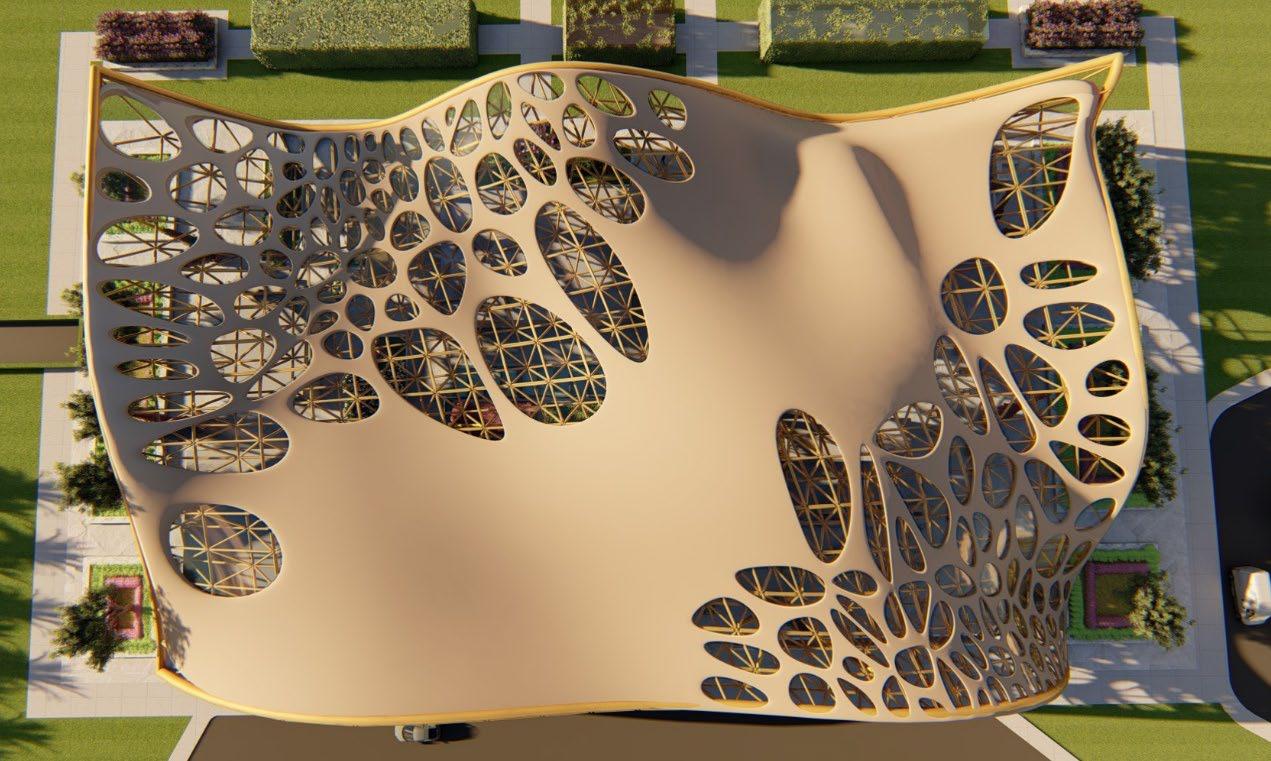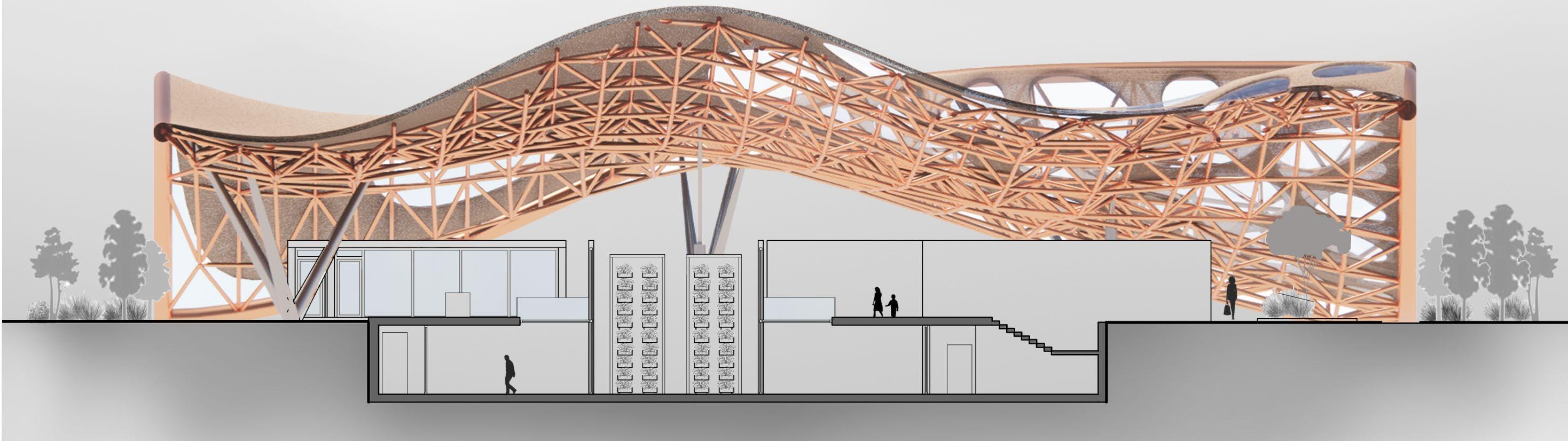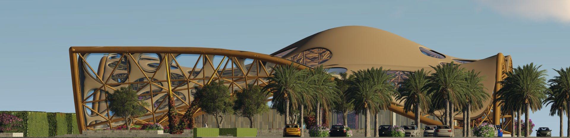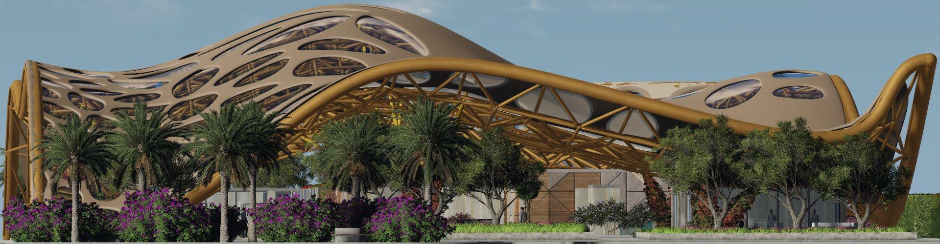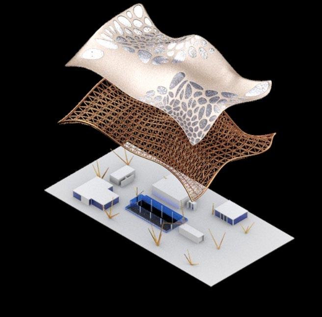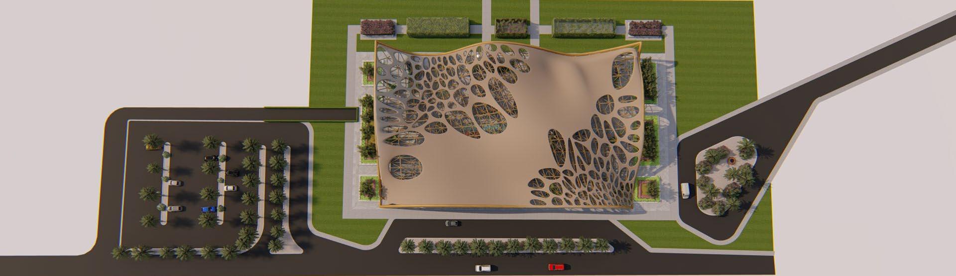 The shape of the widespan structure was inspired from the baskets made up of the barks of date palms and the flexible shape of dessert dunes. This was achieved by having Voronoi structure (with openings) that changes along the way. PROGRAM