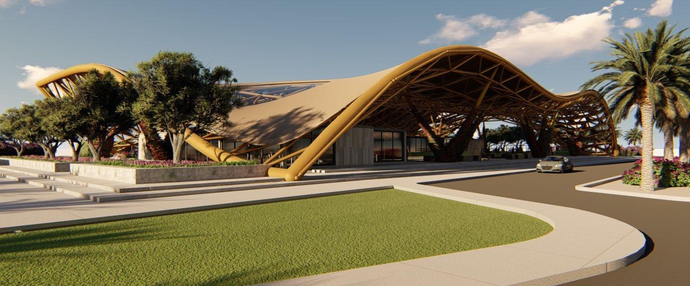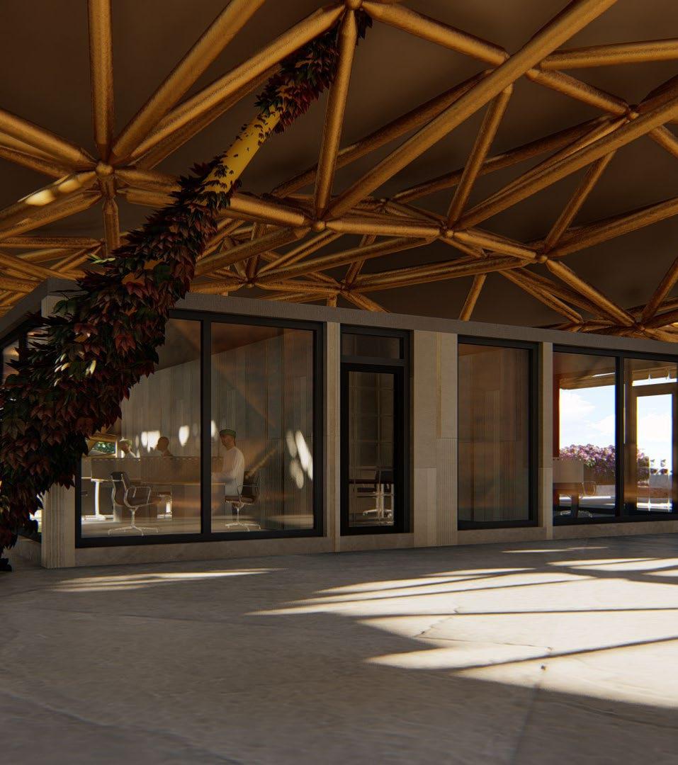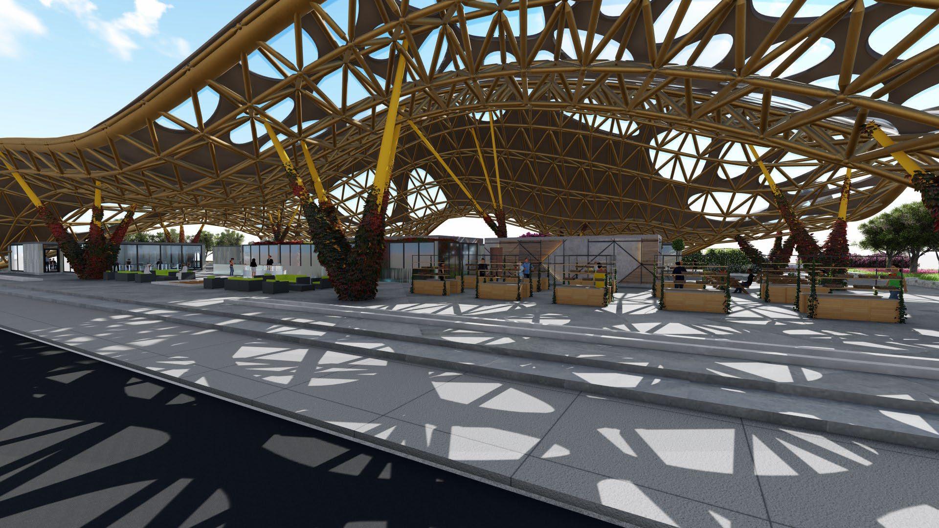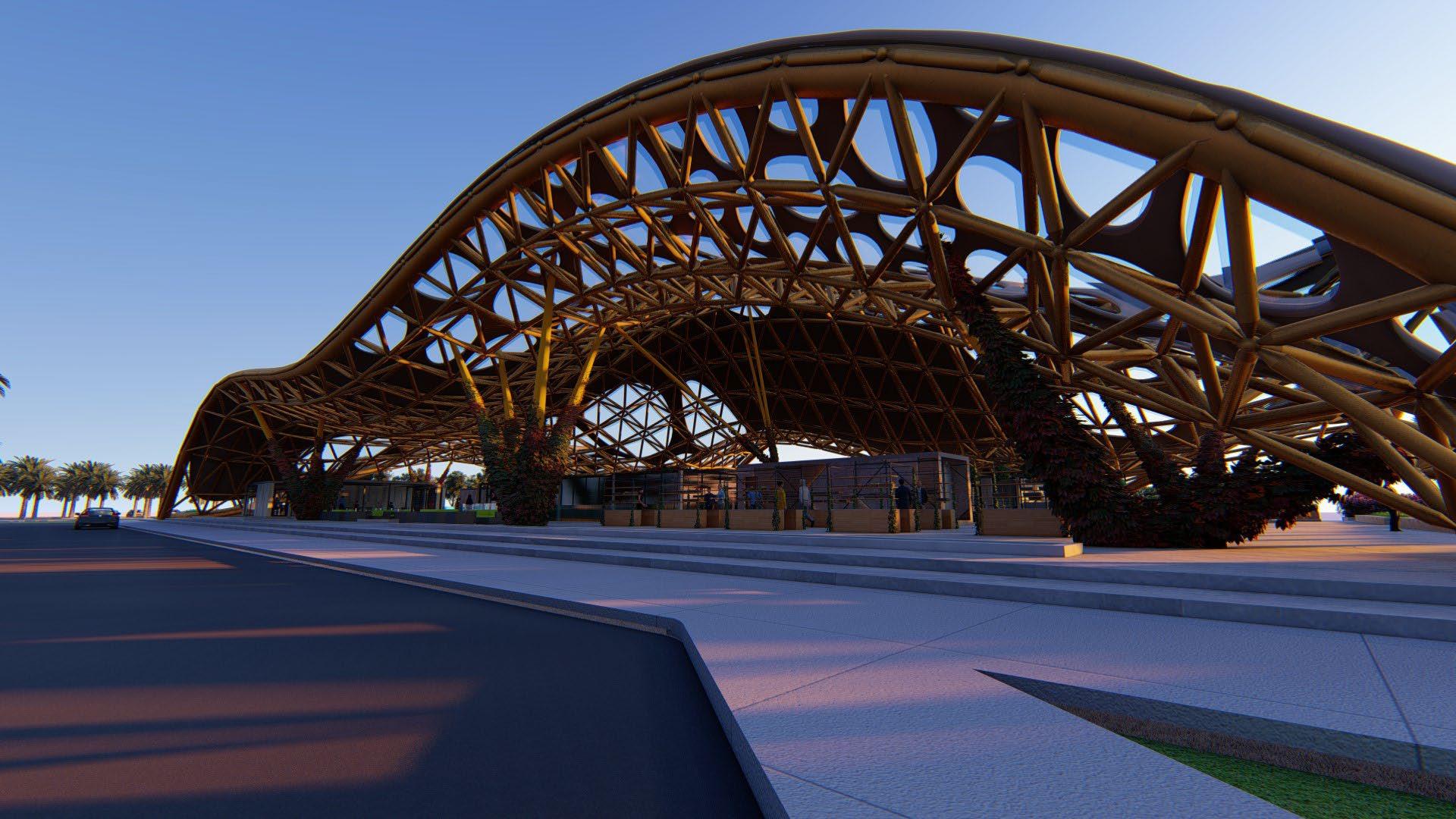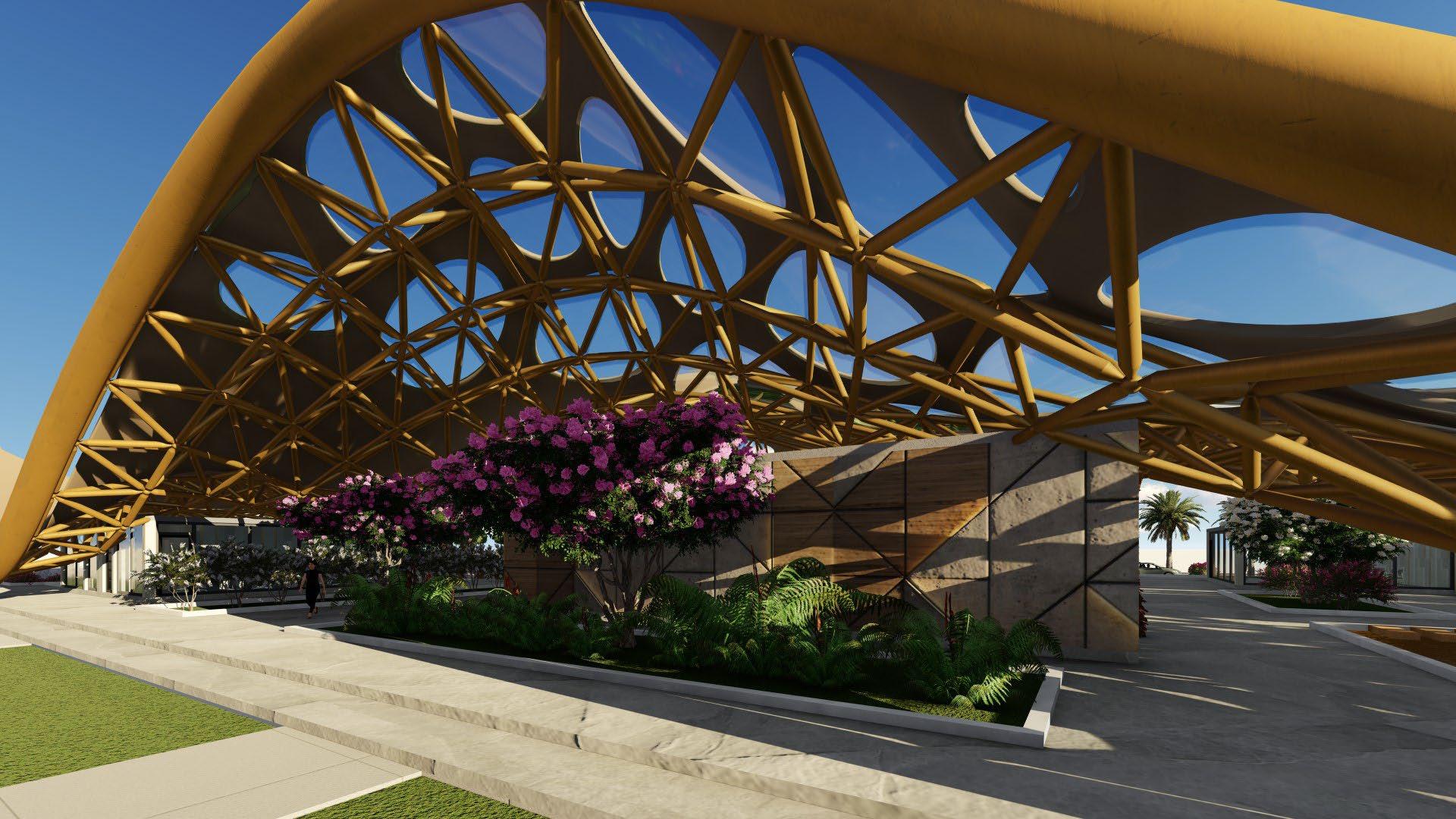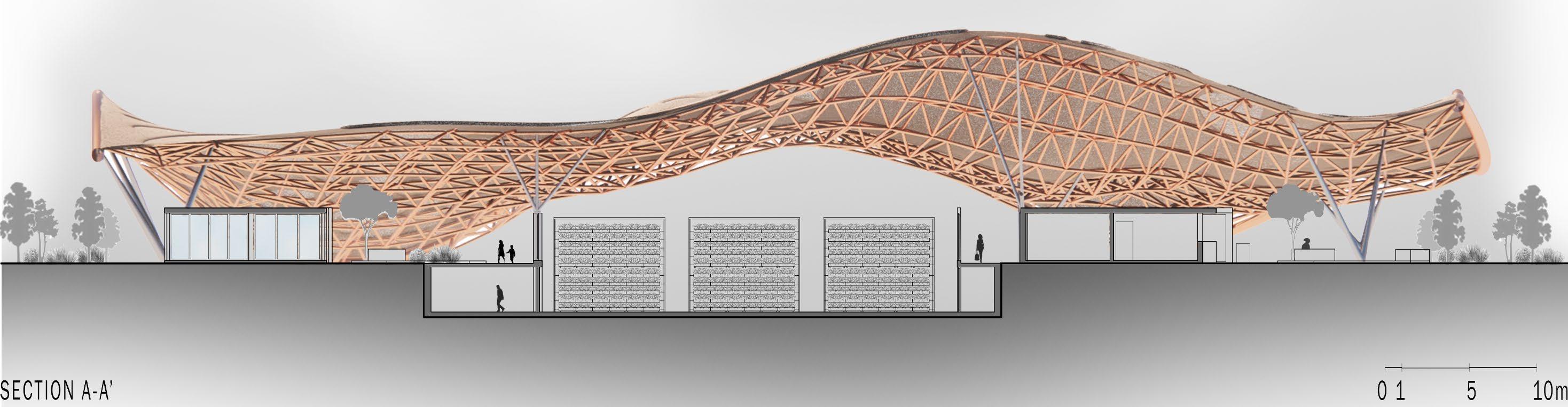 The shape of the widespan structure was inspired from the baskets made up of the barks of date palms and the flexible shape of dessert dunes. This was achieved by having Voronoi structure (with openings) that changes along the way. PROGRAM