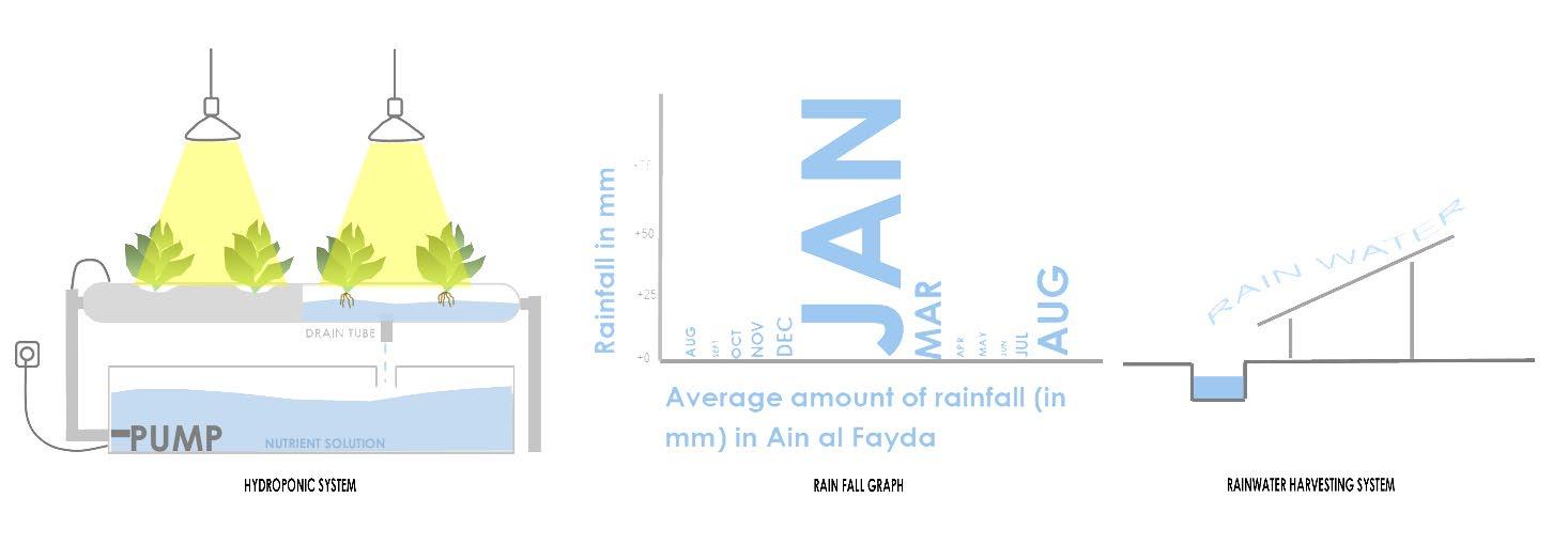 The site is in Ain Al Faydah, Al- Ain, United Arab Emirates. The main issue of this place is the sun (scorching heat which can cause the plants to dry up) , water (lack of water bodies),and soil (not arable land). From the research done, It is better option to go for hydroponic vertical system because it don’t require arable land as its indoor and use rockwool instead of soil, nor a lot for space for cultivation since we are planting vertically by stacking them, nor it requires a lot of water because the water circulates within the system and thereby avoids wastage. The drawback of using this method will be its energy usage as its cultivated under artificial lighting to protect the crops from extensive sunlight. This problem can be tackled with the help of solar system as the area receives ambient amount sunlight. According to the recent year precipitation rate having rain harvesting system will be very helpful to collect some water. Which can be later used for irrigation purpose in greenhouse and net house. As, a part of waste management having biogas plants and human waste conversion, can be good source provide fertilizer for the cultivation and gas for cooking in the cafe. Having cafe in the experimental farm where they serve food using the harvested crops increase the quality of food, can also attract people to come.