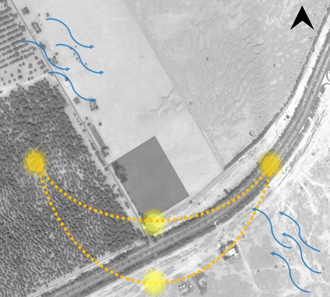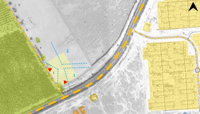 The location of the site is near a date plantation on the side of a highway(AlAin - Abu Dhabi truck road).We can get a view of the farm from the Highway itself. There is a residency near to the site and on the opposite side of the Highway (New Emirati Residential development). There is an existing not registered road access to the site. Currently the site is deserted without any trees or plants. The landmarks or the view are the Dessert, the Jebel Hafeet and the Date Plantation.