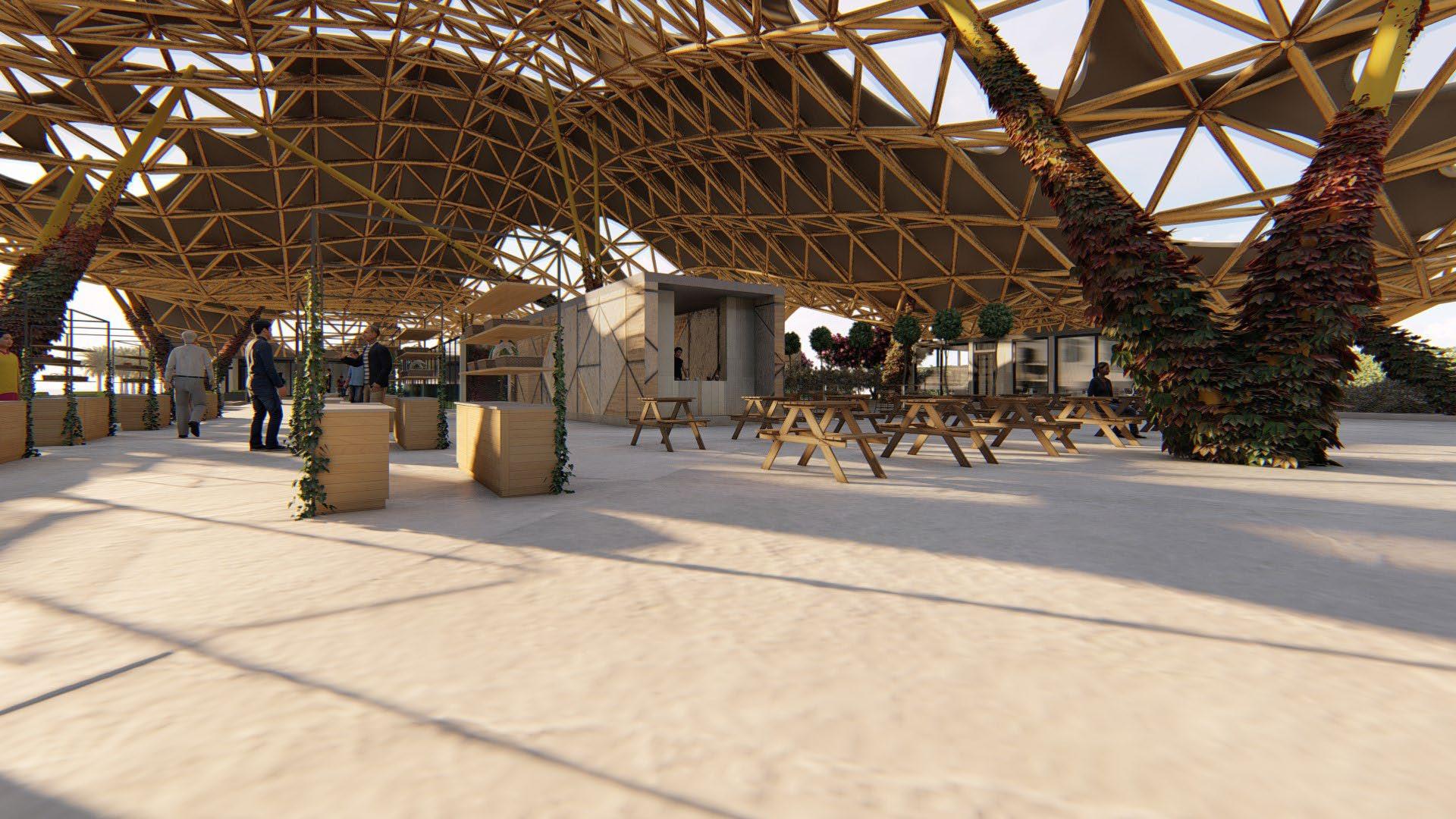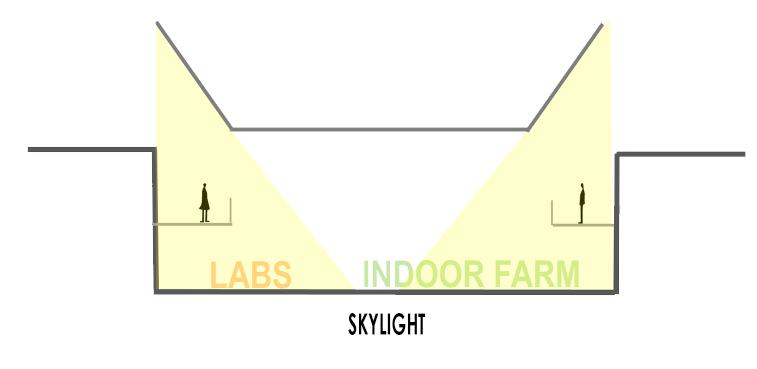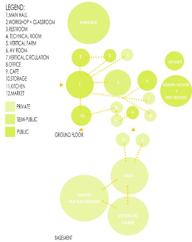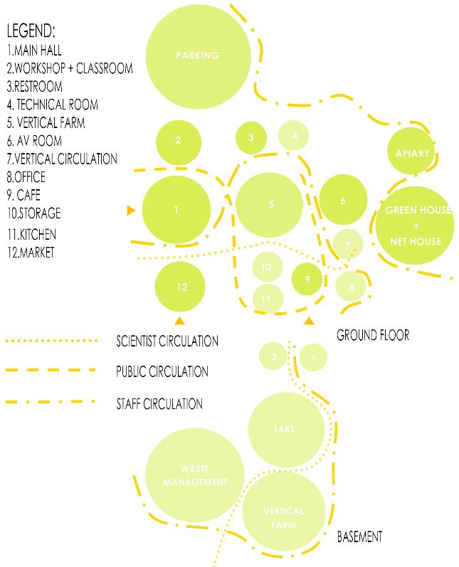It is an open project, which gives a vibe of openness and welcoming. The layout is mainly focused on the vertical farm which extends from basement to the ground floor. All the other function is around the farm. The project has two floor, ground floor and a basement. The basement contain laboratories, vertical farm, restroom and waste management. The ground floor contain main hall, workshop, markets, cafeteria, offices, AV room, and service areas.